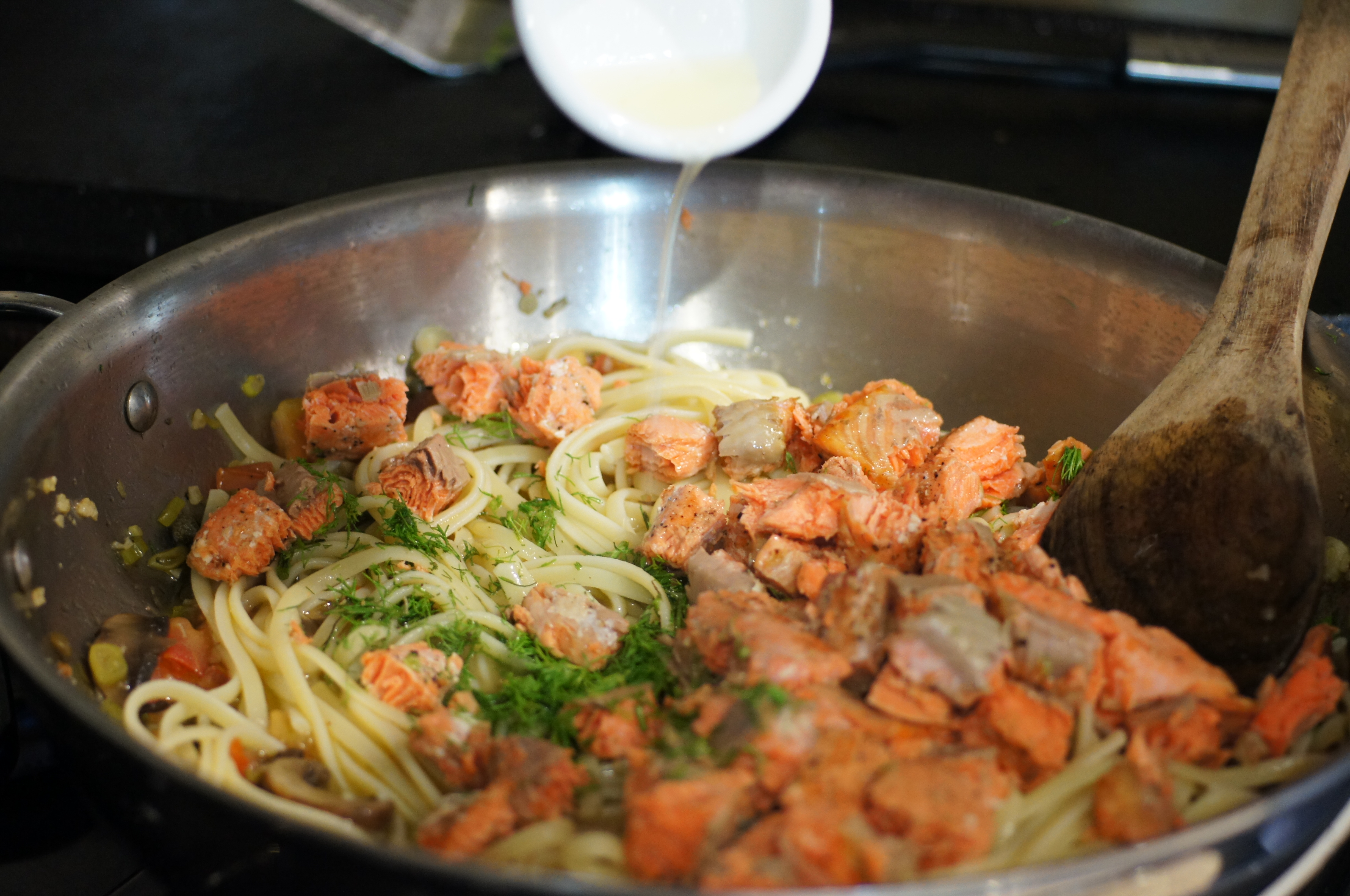 Add pasta, fennel fronds, lemon juice and salmon. Toss to incorporate.