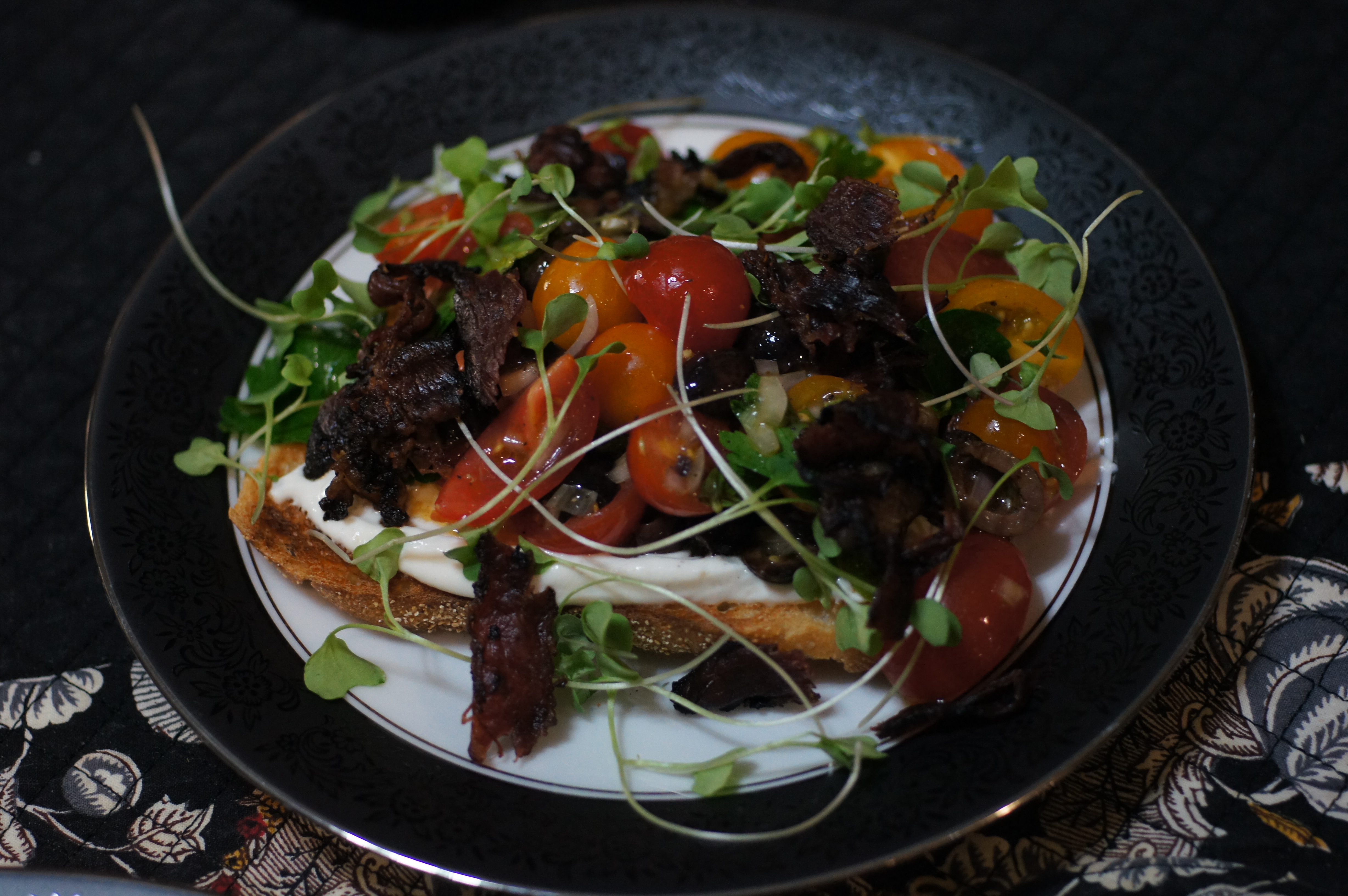 This is an absolutely fabulous dish. You get the creamy goodness of the goat cheese mousse with just a touch of tang, the sweet savoriness of the tomato salad and the crispy saltiness of the crispy pastrami. Amazing!