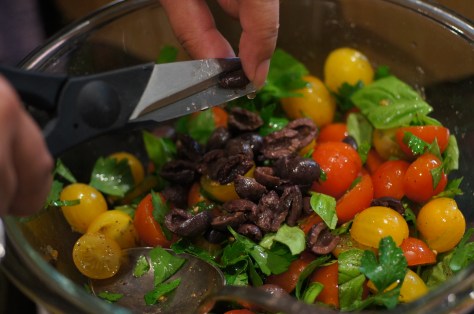 - 1 pt assorted small tomatoes, red grape, orange cherry tomatoes, yellow cherry tomatoes, red cherry tomatoes, sliced in half lengthwise