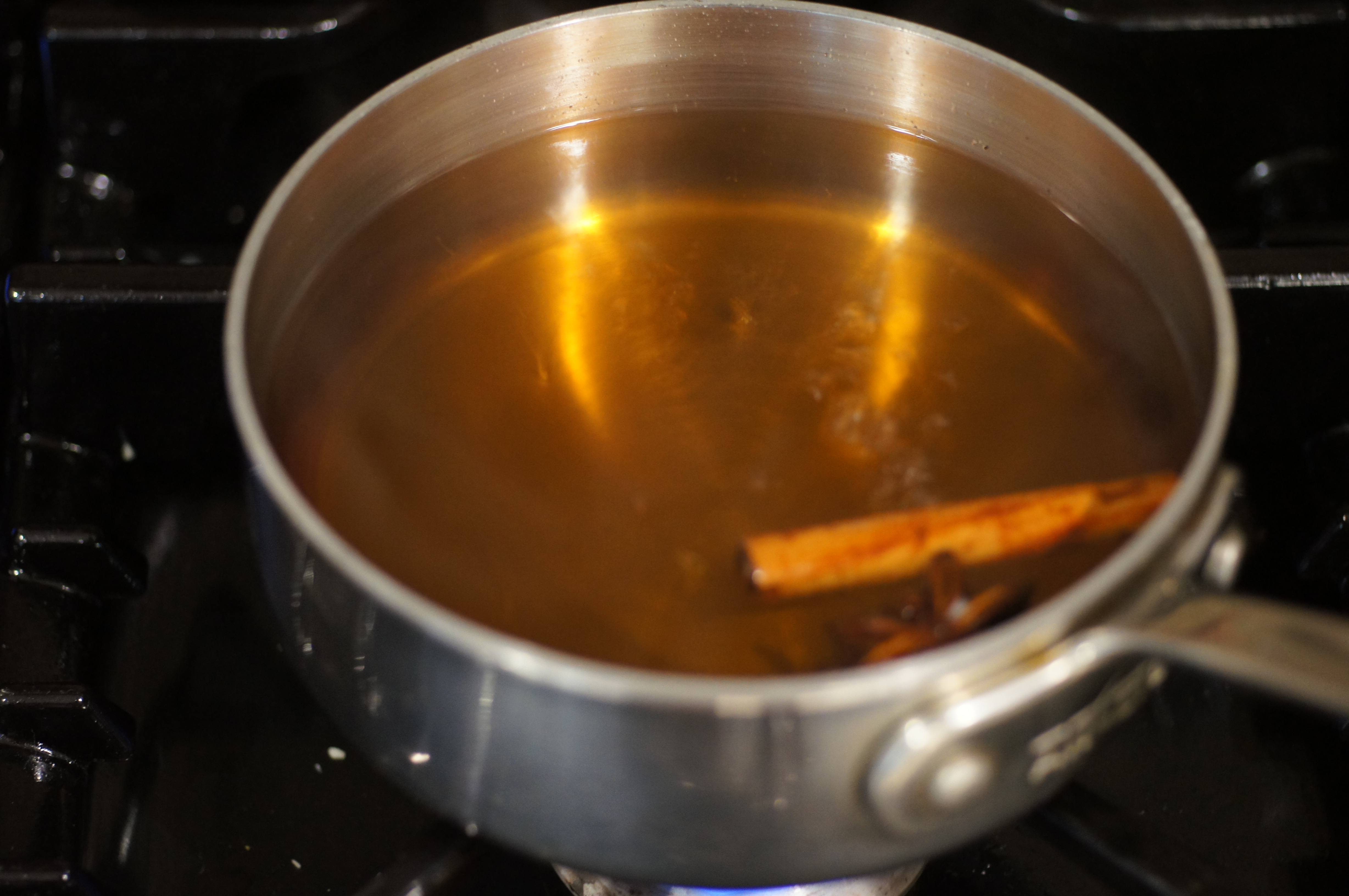 Mix the water, brandy, sugar in a small pot. Add the star anise and cinnamon.