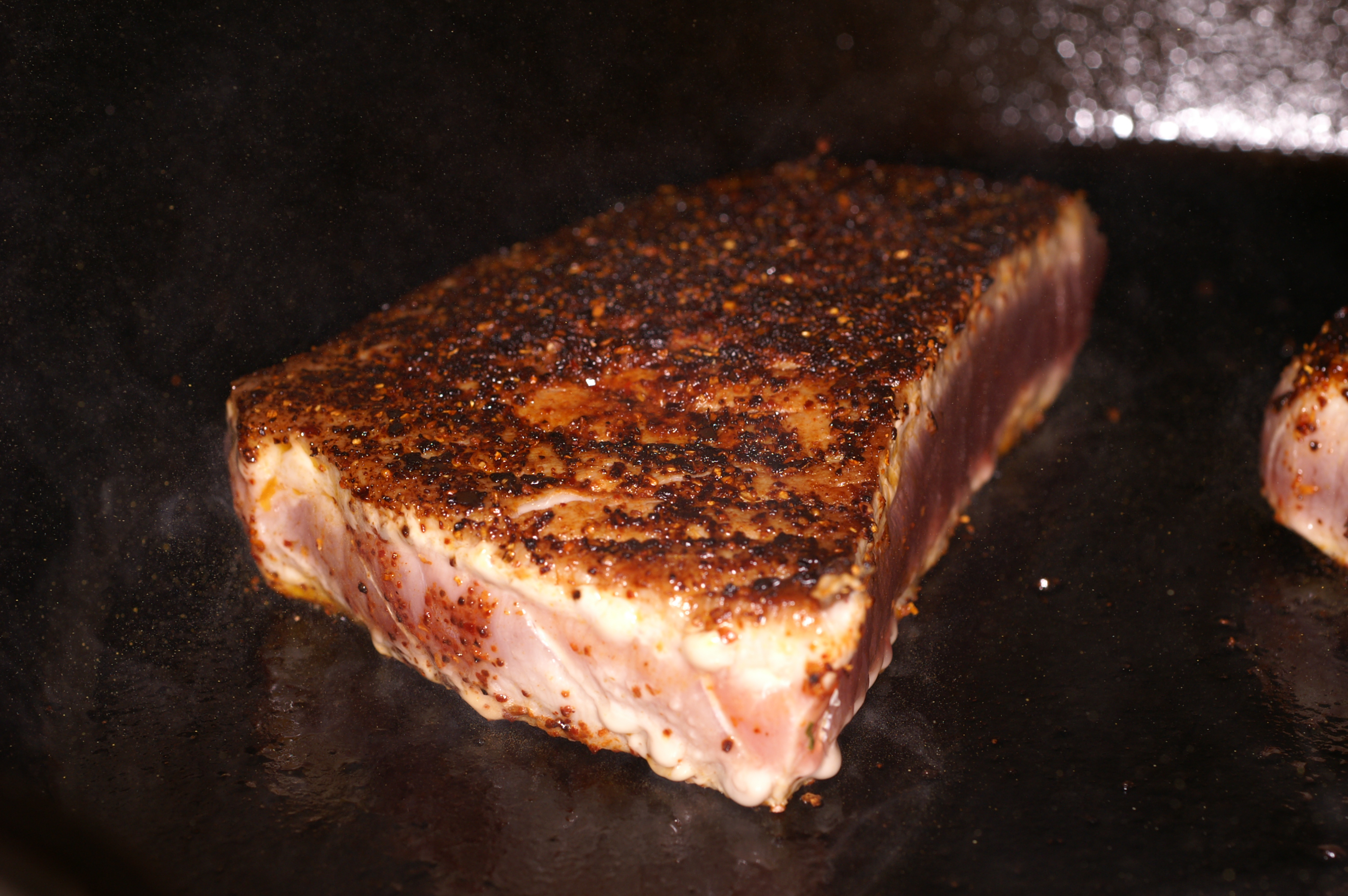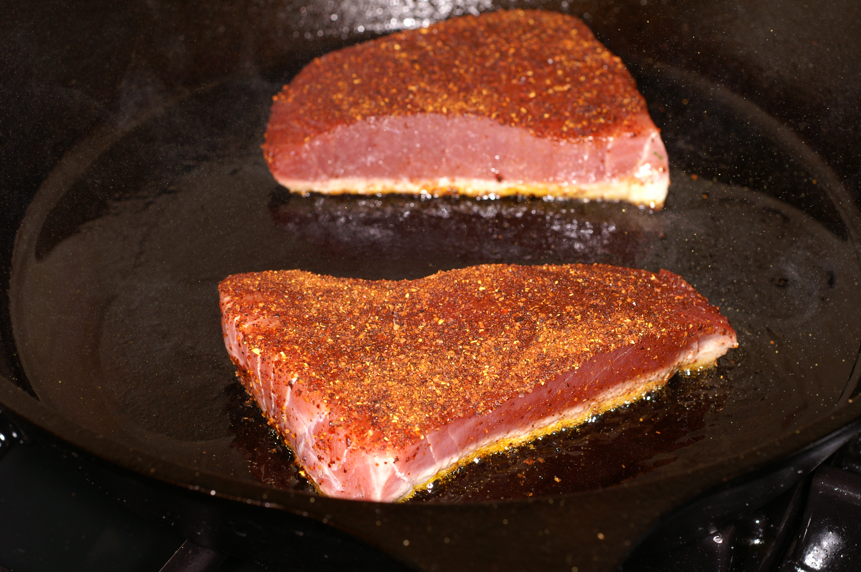 Liberally sprinkle the tuna steaks with the Ancho chile rub. Add the oil to a heavy bottom skillet and allow to heat over high heat. Just when the oil is glassy in appearance and is thin, add the tuna steaks to the skillet.