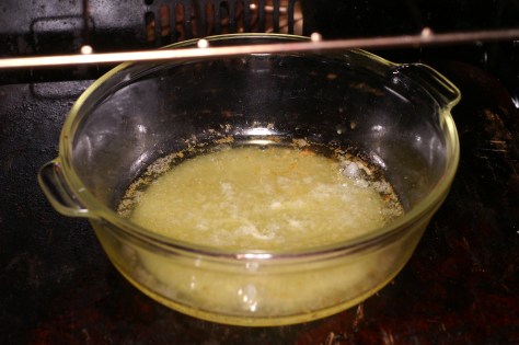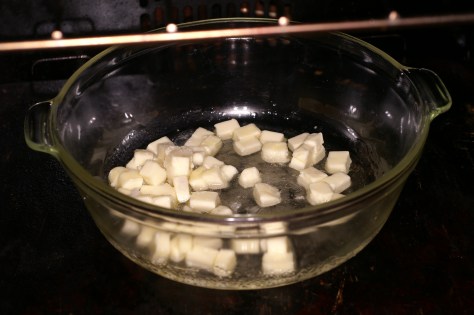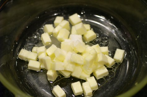 In a medium-sized ovenproof bowl, such as a Pyrex bowl, combine the butter, oil, water, sugar, and salt.