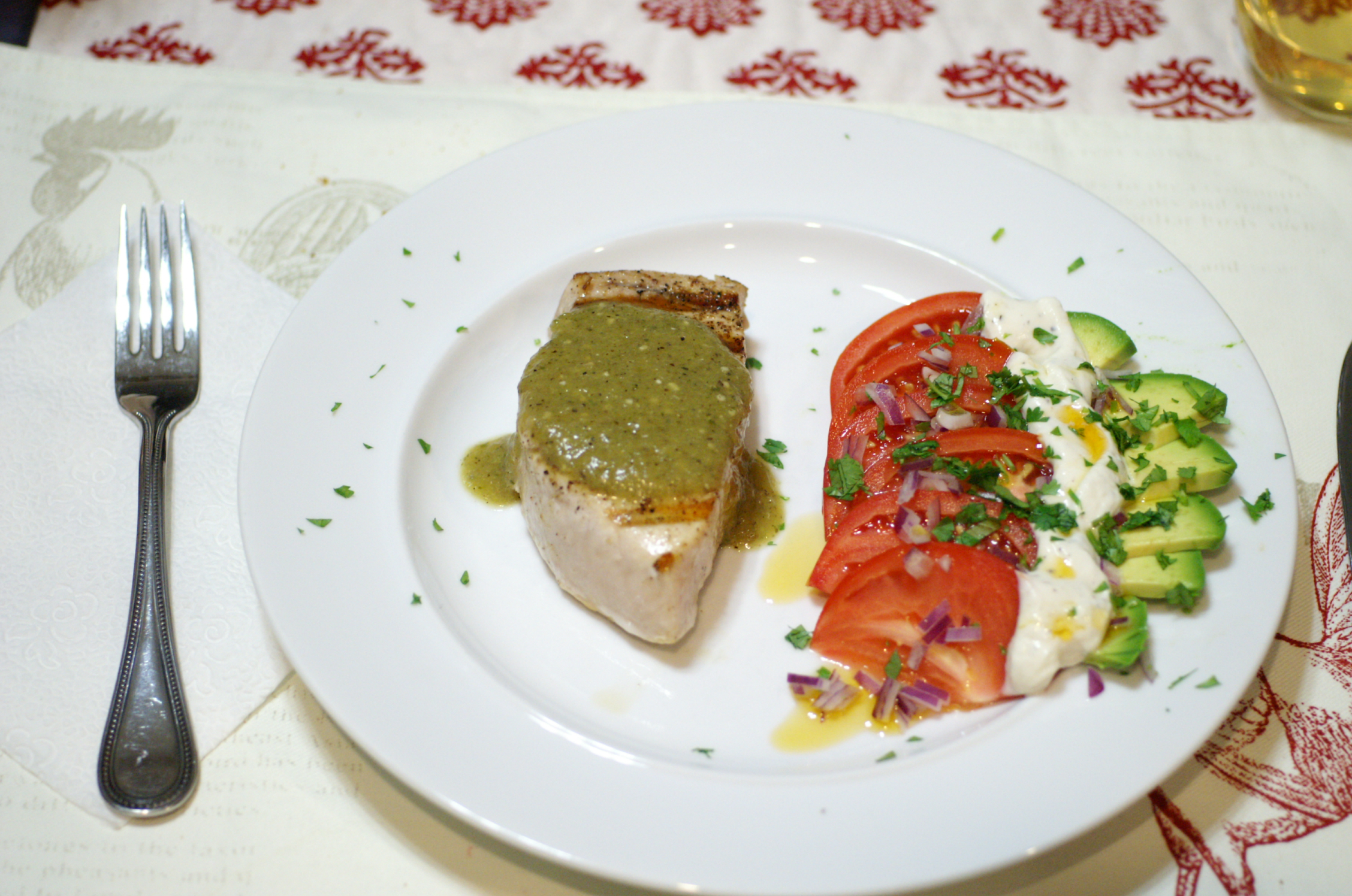 When we made the salsa verde, we had this dish (and one other to be posted later) in mind. Now, inasmuch as I was doing the main course, Baby Lady took over the side and she is the one who came up with the name for the salad because it has to colors of the Mexican flag. The flavors of the seafood dish with the salsa played perfectly off of the flavors of the salad. What a beautiful meal, both in aesthetics and flavor. Give this a try. You won’t be disappointed.