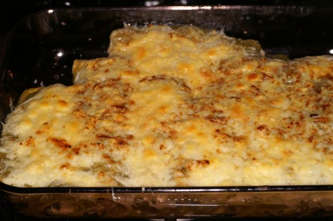 When all of the tortillas are fried, uncover the shredded chicken, set the salsa verde next to the tortillas, and a baking dish next to the salsa verde. In an assembly line process, dredge the tortilla on both sides in the salsa verde, lay in the baking dish and add 1 – 2 Tablespoons of shredded chicken and vegetables in the middle. If you desire, add a little cheese at this point, too (I don’t). Roll the enchilada into a cylinder and repeat the process until all of the tortillas and chicken are used. Pour the remaining salsa verde over the top.