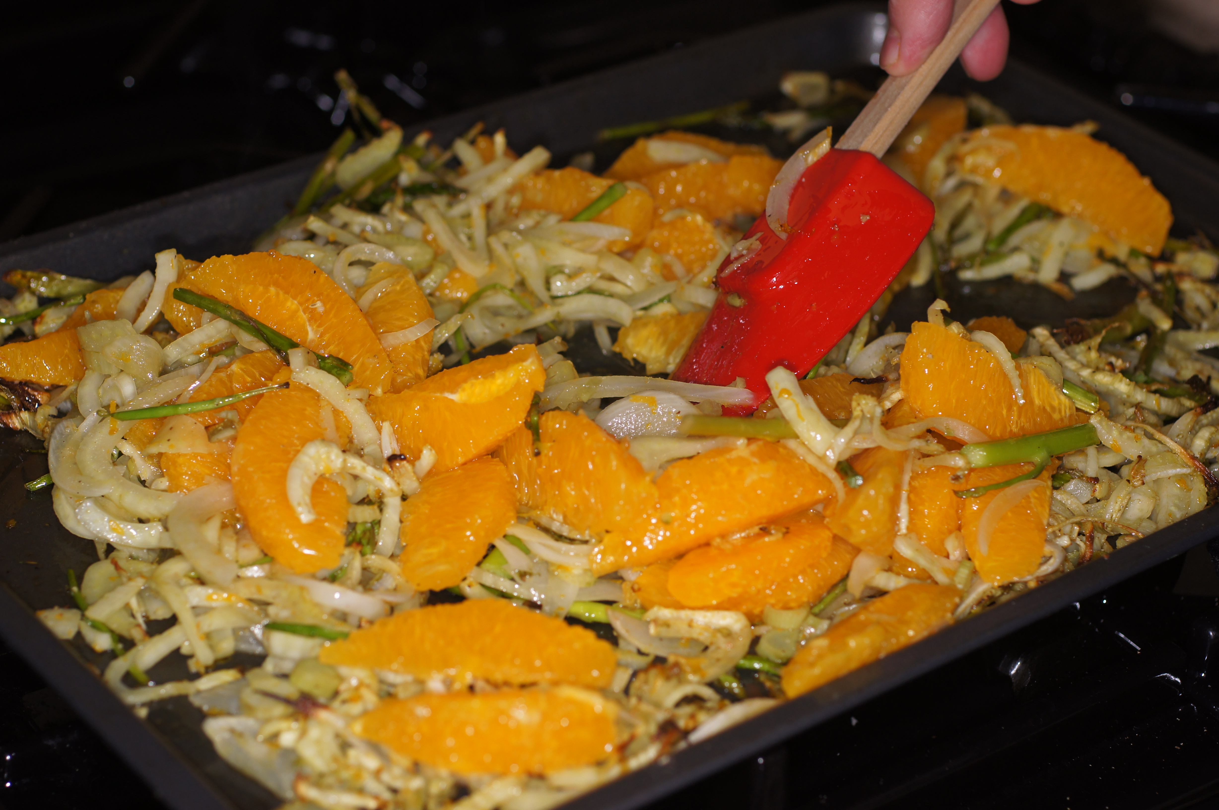 Remove the fish from the oven and tent. Remove the veggies and mix with the orange supremes.