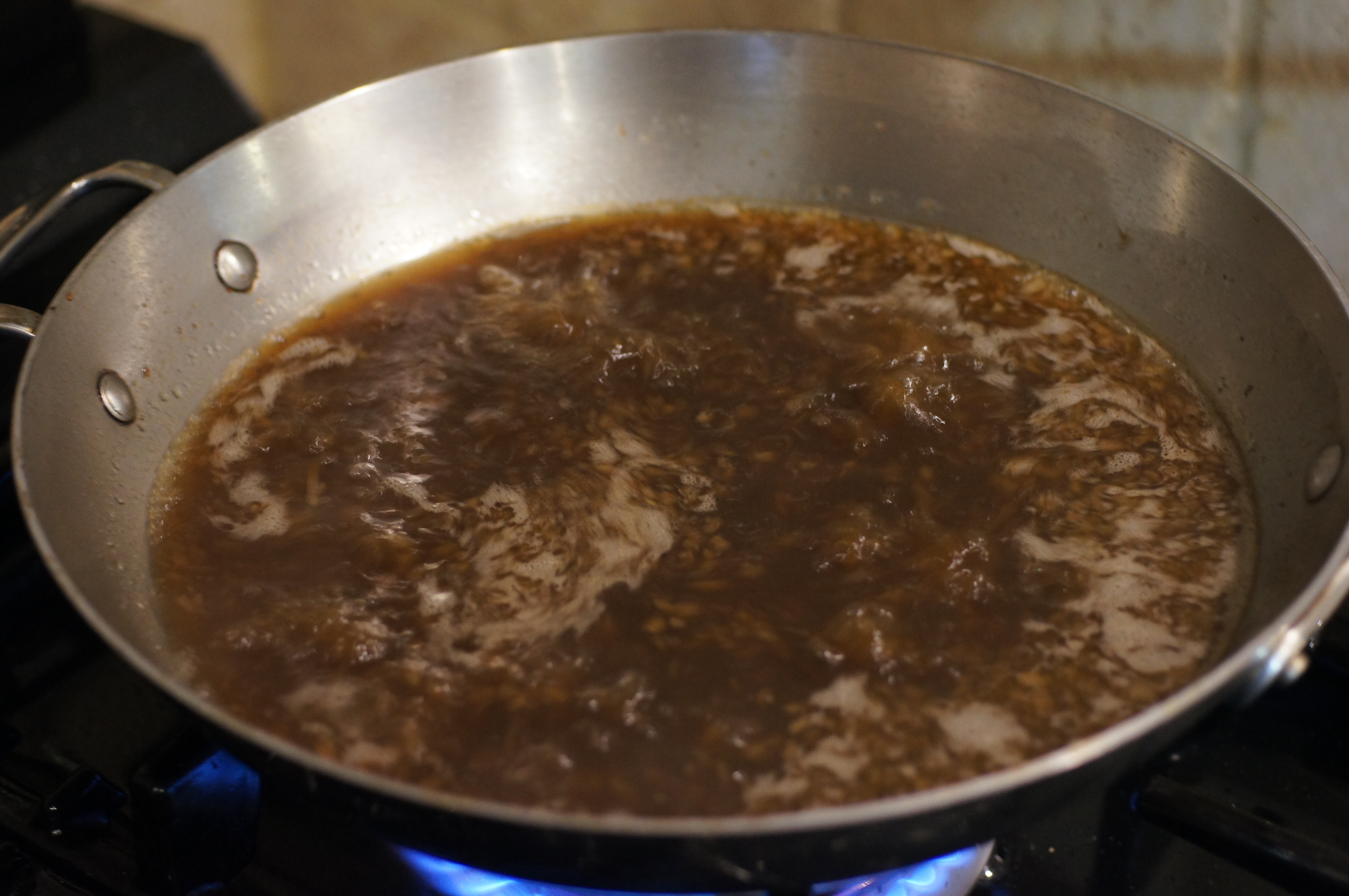 Add the chicken stock and deglazing liquid and brown sugar to the shallots.