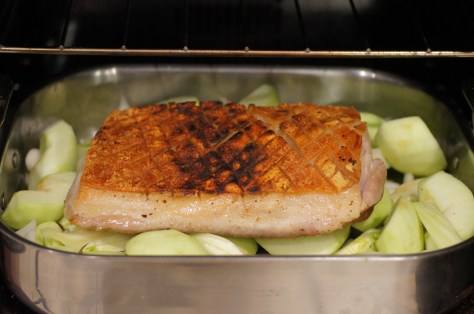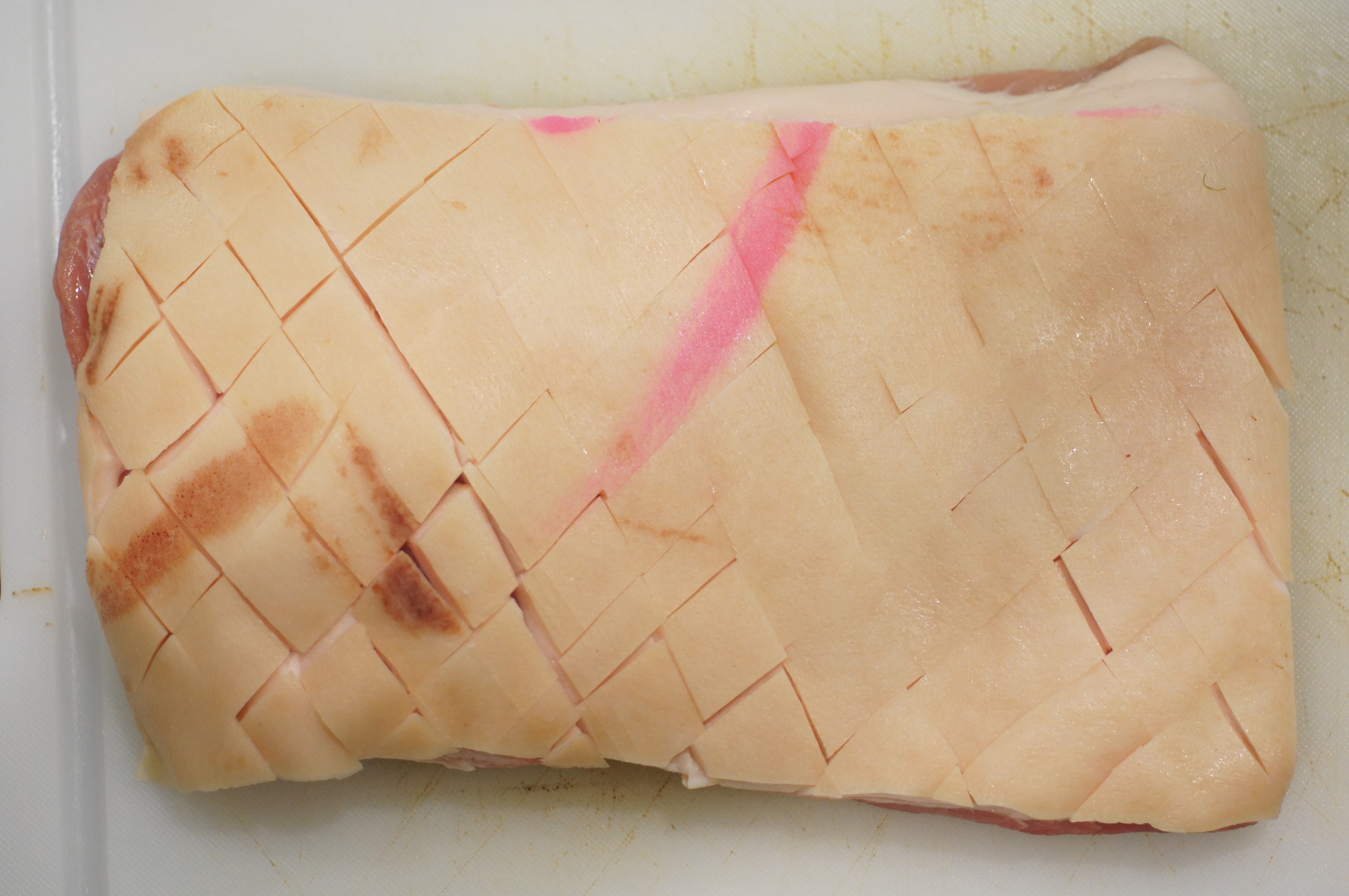 Dry the pork belly and cut diagonal squares into the skin deep enough to go to the fat but not so deep as to cut the meat.