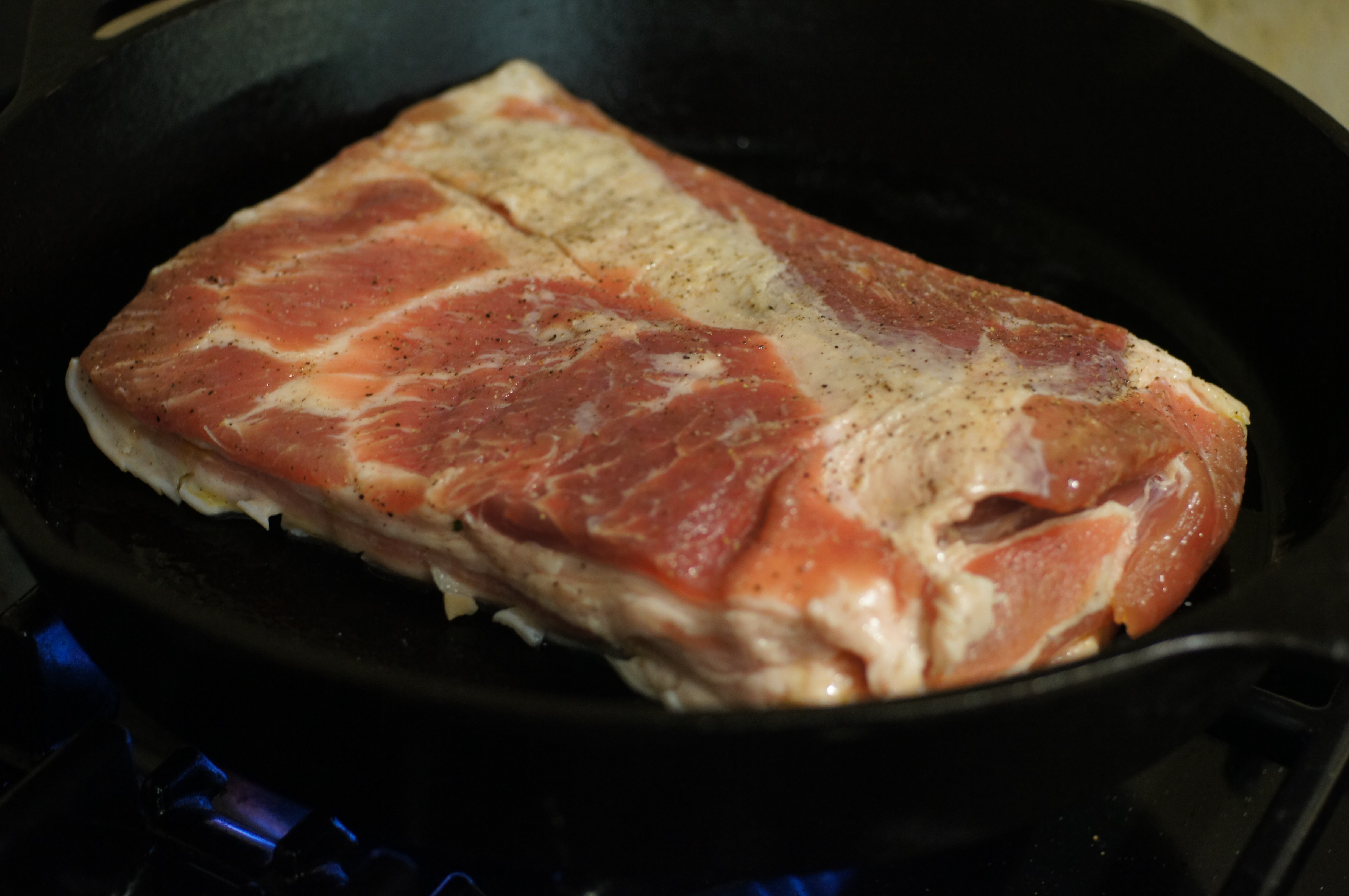 After 30 – 45 minutes, in a large heavy bottom pan, pour in 2 Tbsp olive oil and over medium-high heat, heat the oil until you can place a wooden spoon into the oil and while pressing down it begins to bubble. Once this occurs, add the pork belly skin side down.