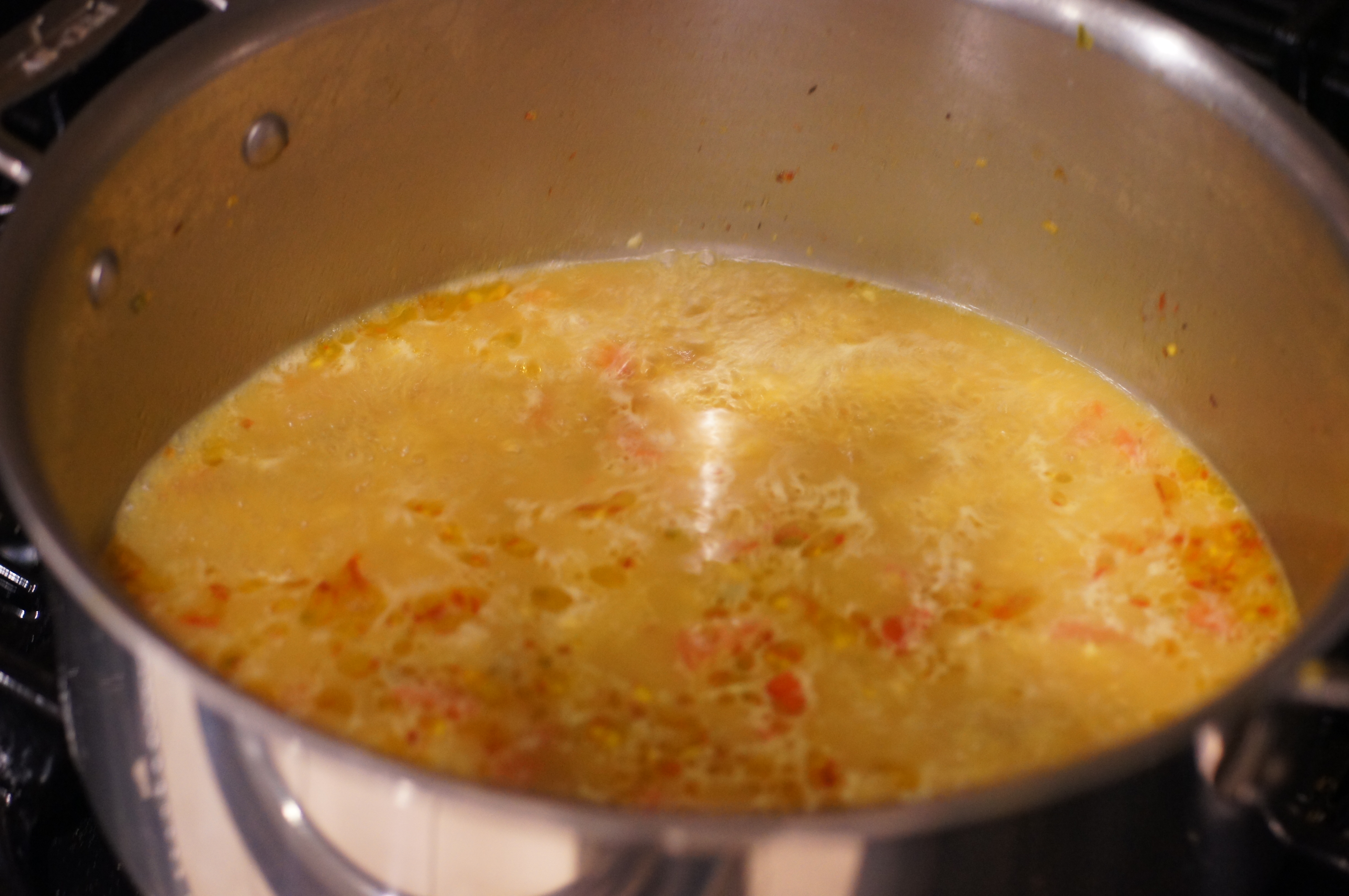 After 1 minute, add the tomatoes, saffron, black pepper, crushed red pepper, wine and mussels.