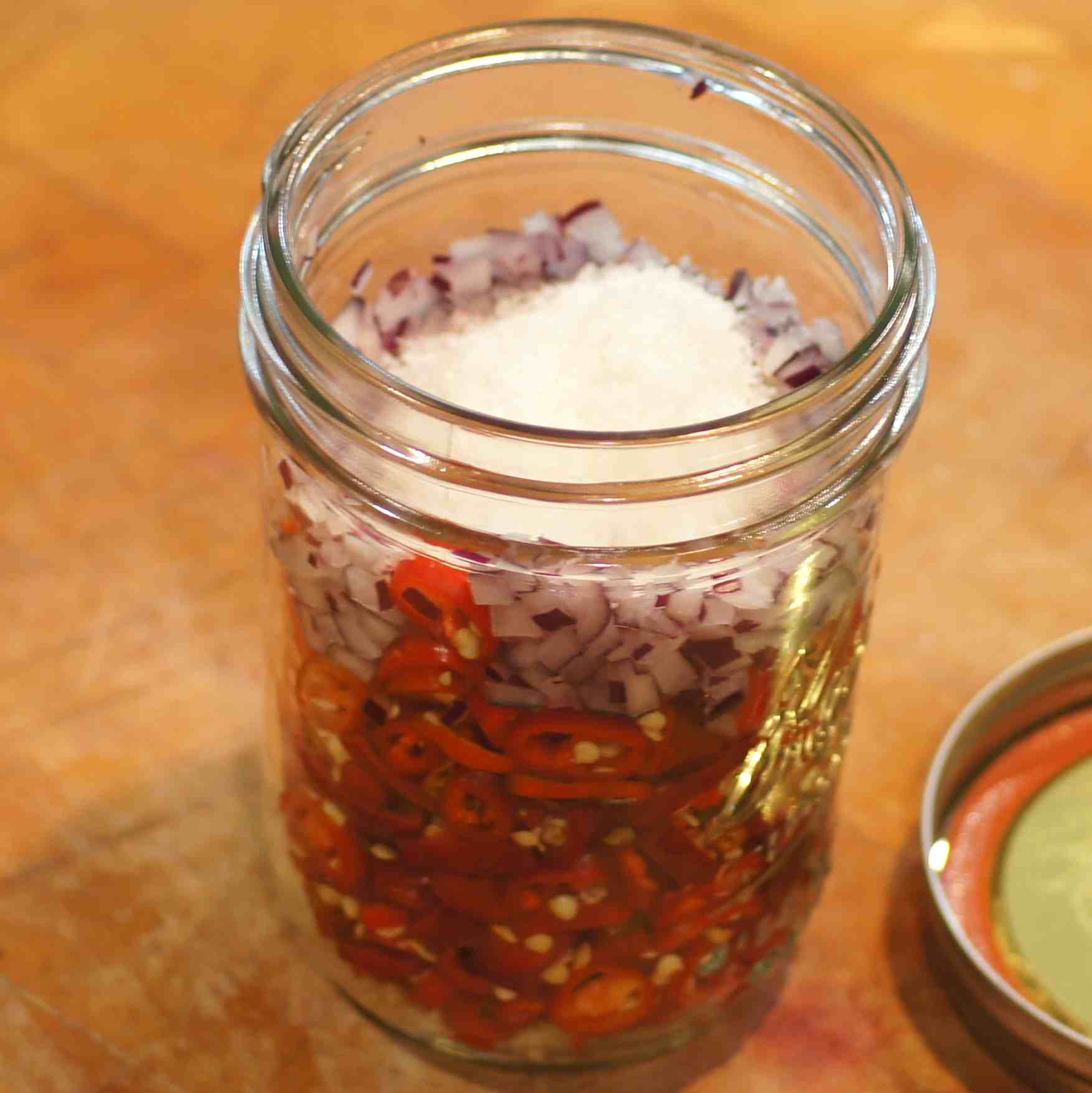 Hi, Iva. Thanks for finding us. 🙂 In the pint/quart jar method, just pack the chiles and garlic in as tightly as you can. Add the salt and pour the bottled water over the salt making sure there is enough water to cover the chiles. The salt will dissolve in the water. Put the lid on and tighten it down securely. Don’t worry about weighting the chiles down. What is occurring is a slow fermentation process. This will give off CO2 which will displace the O2 and prevent spoilage. The lactobacillus grows in an anaerobic environment. So, keep the jar closed at all times for the next two weeks. If some of the chile float above the water, it’s OK. Just leave the chiles alone. After 2 weeks, pour everything in a blender (liquid, garlic & chiles) and blend at the highest speed for 1 – 2 minutes. I have a Vitamix so I only blend for 1 minute. A typical household blender would need the full 2 minutes. Strain and refrigerate. You may can the hot sauce but you will kill the lactobacillus. It will keep in your fridge for 6 months. Also, keep the pulp and refrigerate it as it is a great addition to eggs, soups, stews, sauces, etc. It will be a tad hotter than the sauce. I hope this helps. 🙂