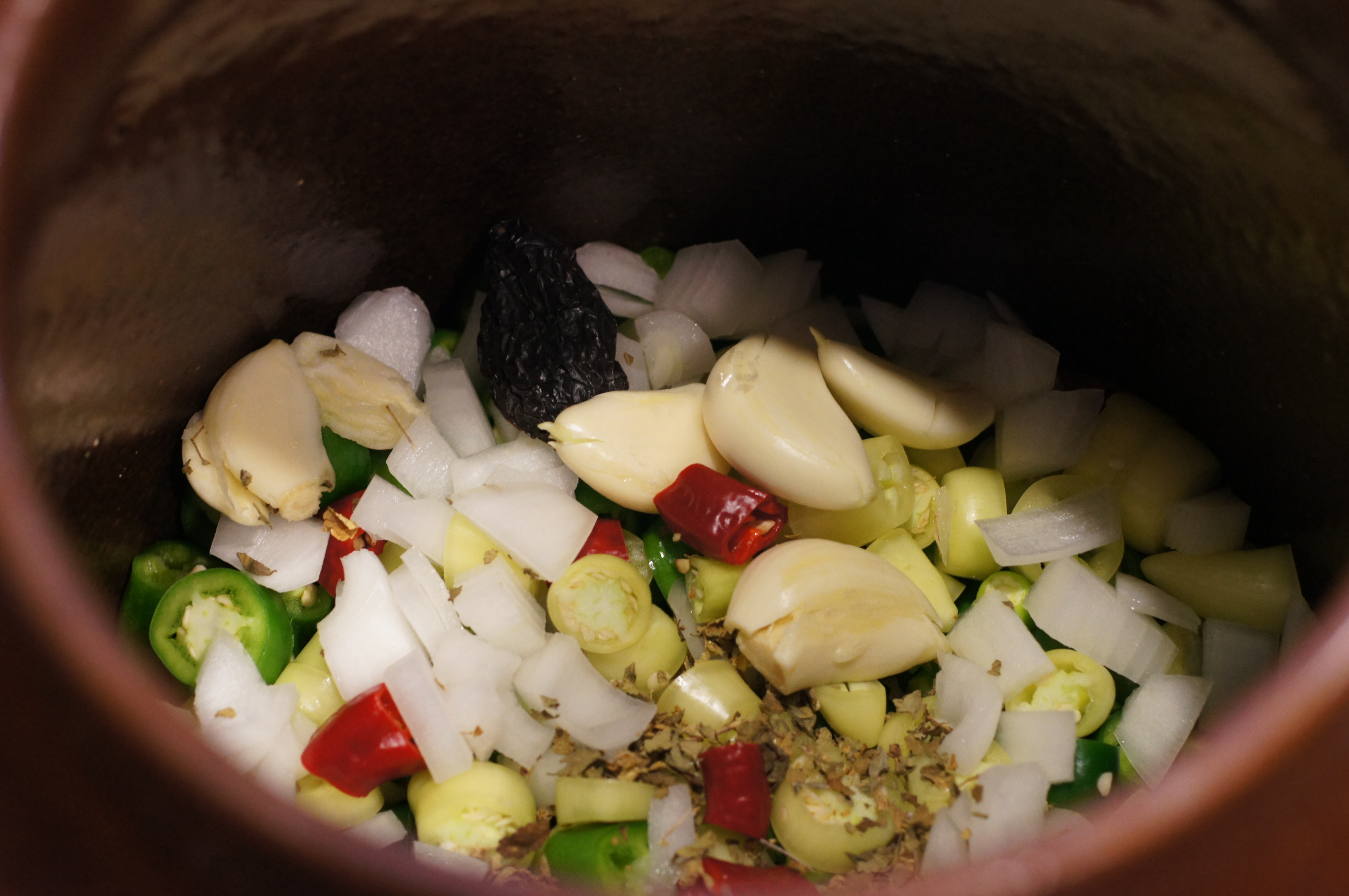 The second batch was green because I was trying to use the remaining chiles before the first frost/freeze and they were green. This time, however, I used my Harsch/Gartopf fermenting crock and the following