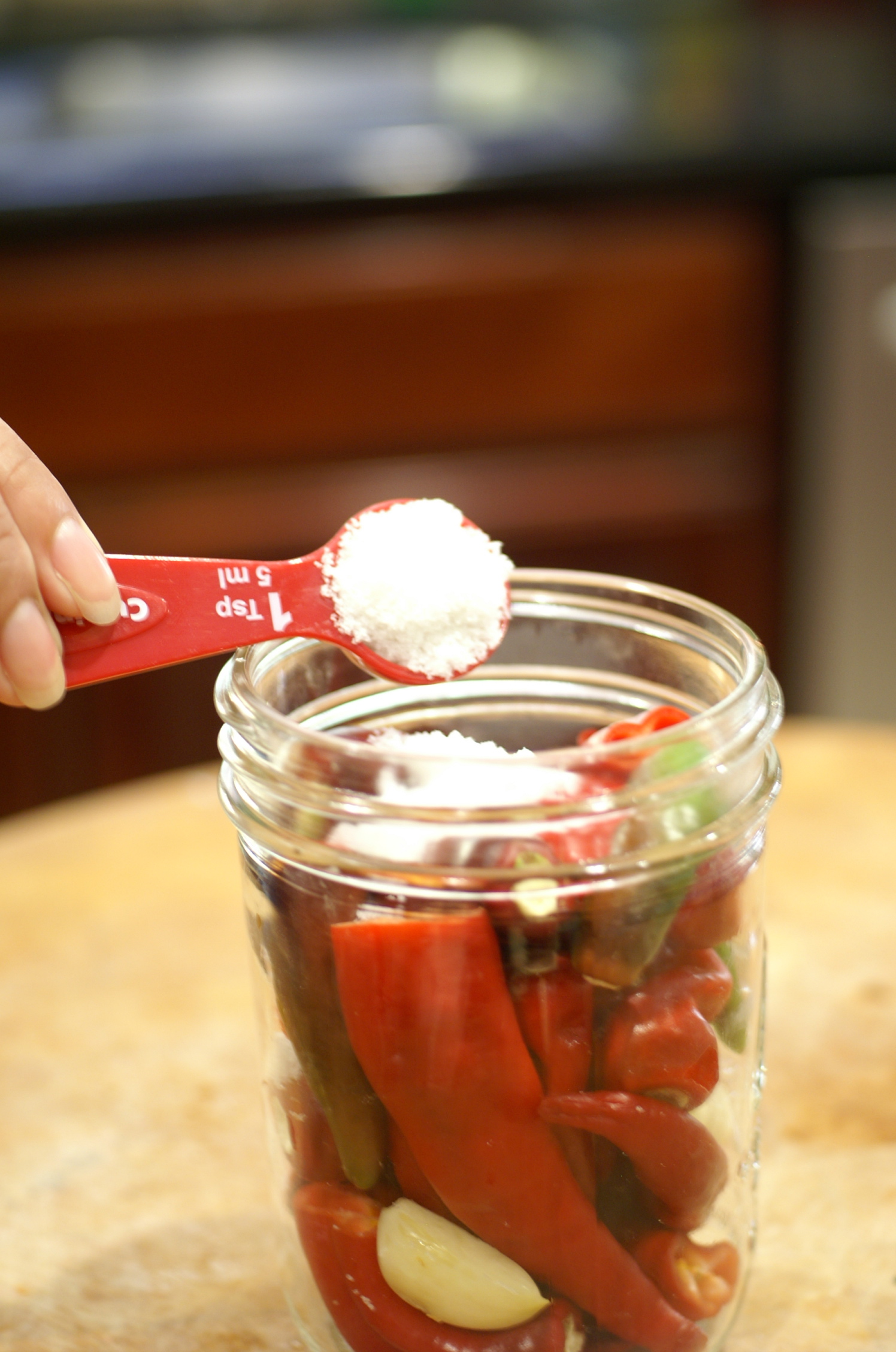 Cover the cayenne peppers with bottled spring water or water filtered through reverse osmosis. Now, some of you are asking why bottled water? Well my friends, tap water contains Chloramine to prevent disease causing bacteria and pathogens. Chloramine (as CI2) is formed when ammonia is added to water containing free chlorine. So if you remove the chlorine, the ammonia stays. This will inhibit the production of lactobacilli bacteria and create other issues when you pickle something. So don’t use tap water. If you must use tap water, add 1 tsp white vinegar to the brine to help “kick start” the fermentation process.