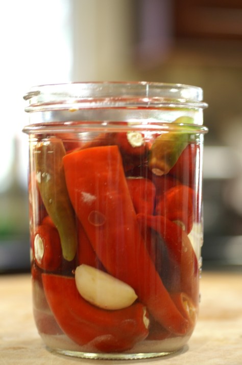 but they are the ones we have the most difficult time using and I refuse to waste them. I had toyed with the idea of drying and powdering them but that seemed such a waste. Then it dawned on me. We use a fair amount of hot sauce so why not make our own. So off to the internet I went trying to find a good hot sauce recipe. Everywhere I turned I found all sorts of recipes for cayenne chiles and vinegar. People claimed this was the same as Dave’s Insanity Sauce. Although it was tempting I wanted something that was aged. So I thought a little more and figured if I could brine cucumbers to make pickles then why couldn’t I brine cayenne chiles and make a hot sauce? The lactobacilli bacteria would give the peppers a nice tang and the peppers would keep their heat. Add a little garlic for additional flavoring. Why not give it a try? So I did and the results are in.