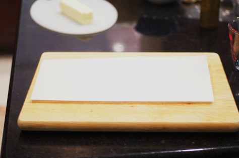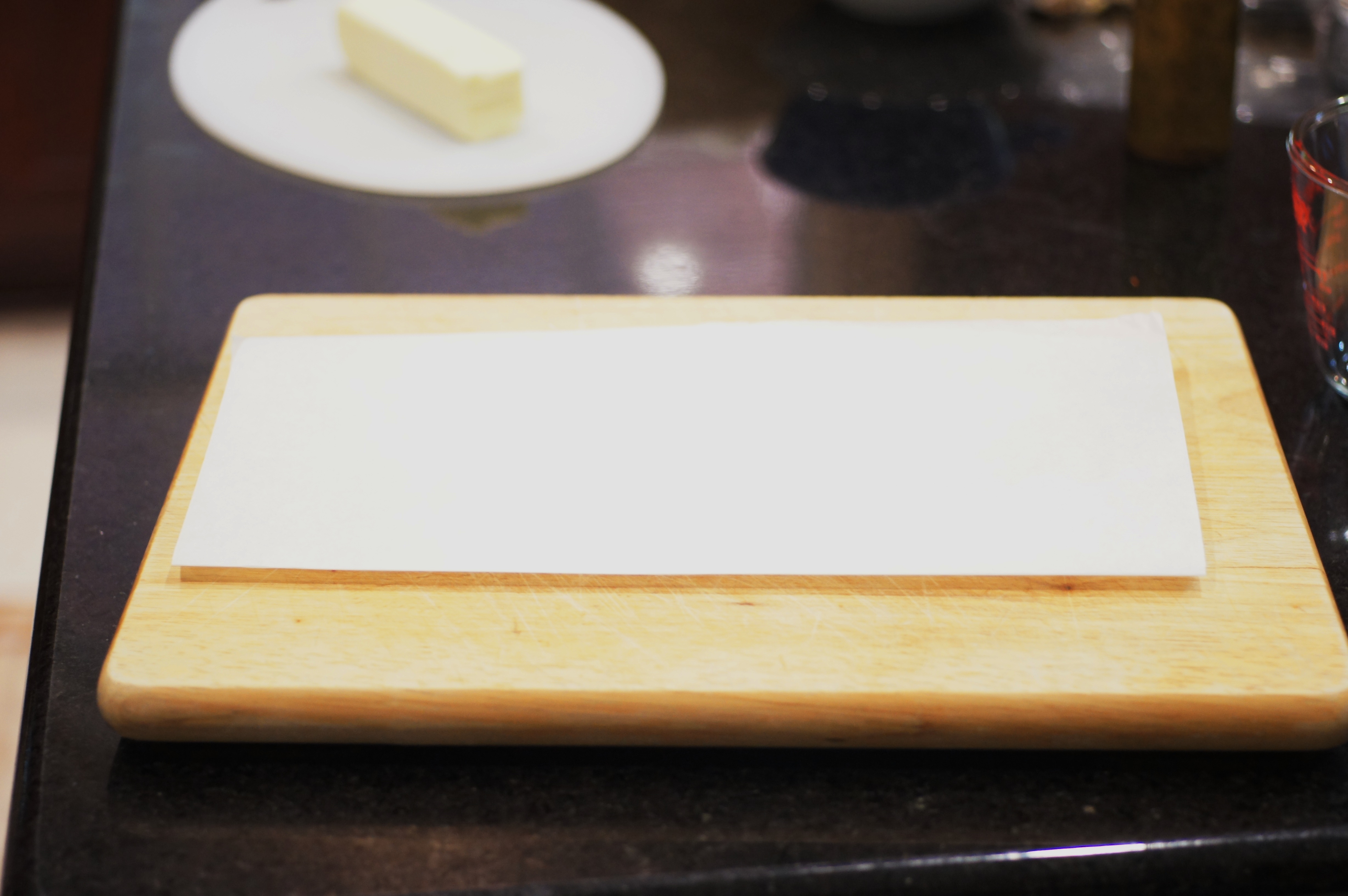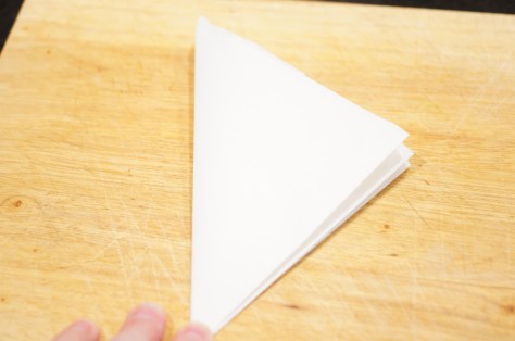 Tear a piece of parchment paper from the box as close to a square as possible. Fold it in half.