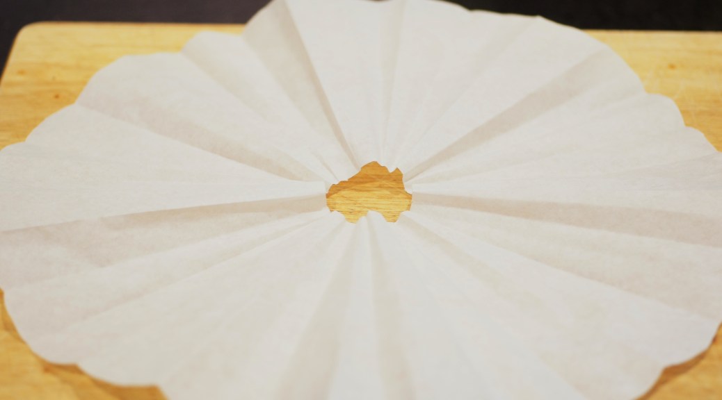 OK, I know some of you are thinking that you know about baking and en papillote. We’re talking about a paper lid. Let’s be real. Why would you ever want a paper lid? Well, a parchment paper lid is another one of those French techniques that has been around a while. In France, it is referred to as a cartouche. Its purpose is to control the rate of evaporation, which in turn slows the reduction of moisture and concentrates a sauce or stew in a much more efficient way. It’s used in preparations where you are trying to control heat and evaporation, for instance poached fruits, onion confit, braises, etc. In these applications, if you simply use a standard pot cover the heat inside the pot will get too high resulting in the food cooking too quickly, turning to mush and not holding as much flavor. On the other hand, if you leave them uncovered, too much moisture will be lost and the food will not be done. Another effect would be the food will also be exposed to the air resulting in it becoming discolored. A parchment cartouche is the answer. We’re going to use a parchment paper lid in the next post on Onion Confit so you will actually see it in action (as much as action can be depicted in still photography). It is simple to make and works like a charm. So without any further ado, here is how you make a Parchment Paper Lid.