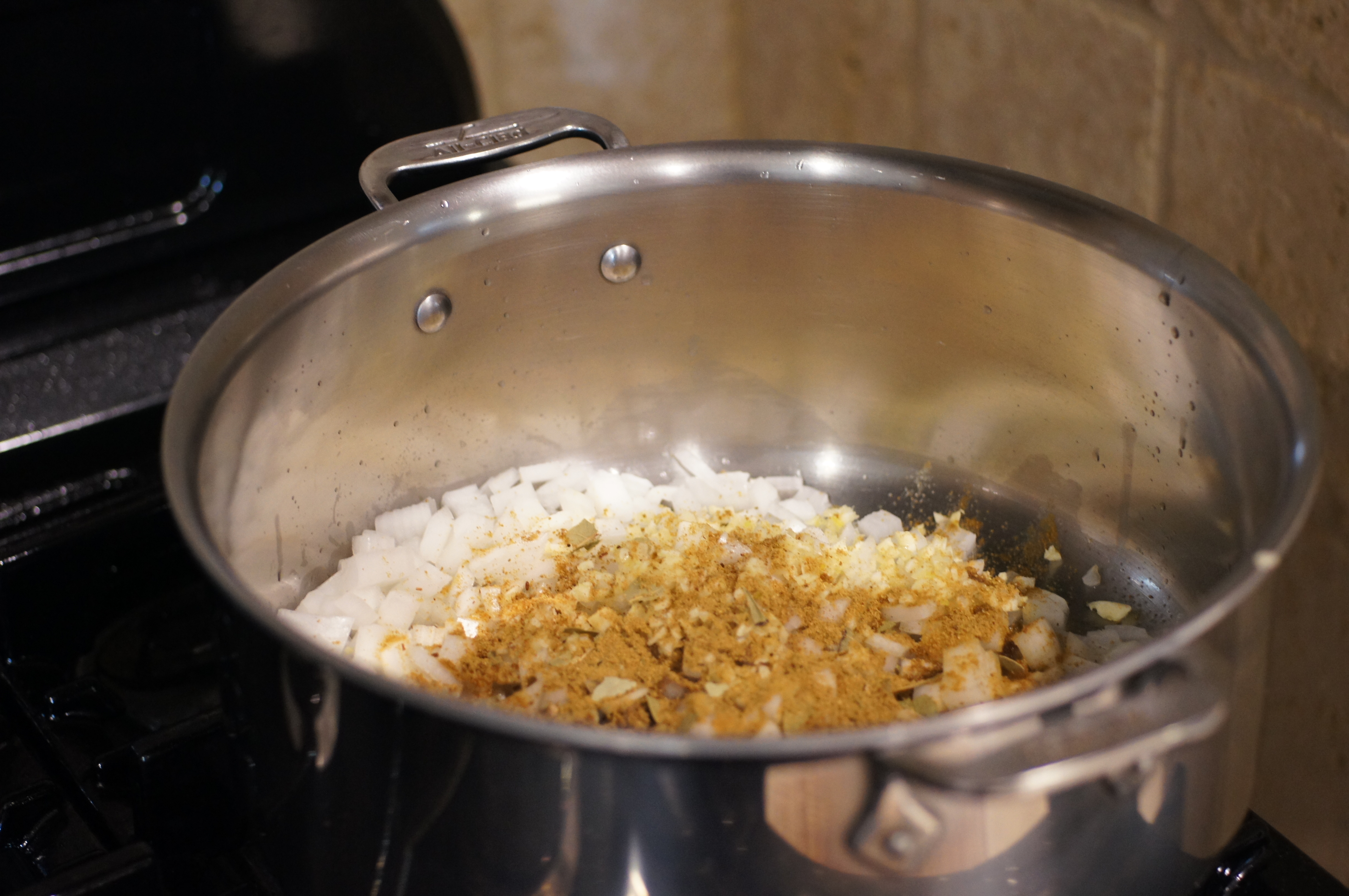 Heat a large heavy pot over medium heat. Melt lard and add onion, garlic, bay leaves, oregano, coriander, cumin, and allspice.