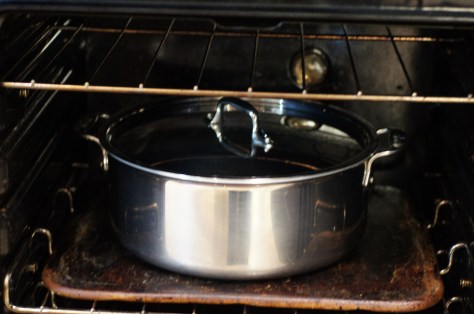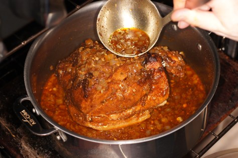 Braise pork for roughly 2-1/2 hours, until very tender, basting occasionally with pan juices.