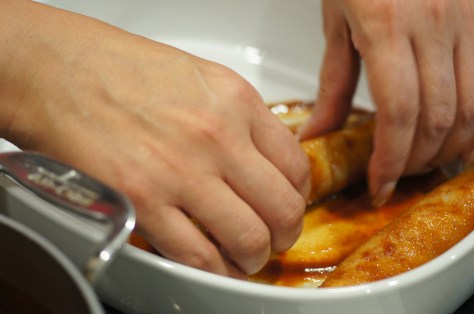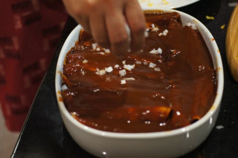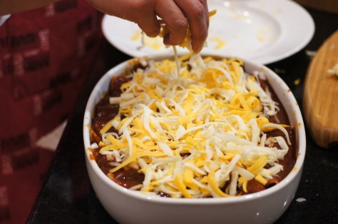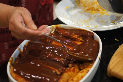 Once you have filled the baking dish with rolled enchiladas, spoon the remaining red chile salsa over the top of the enchiladas.
