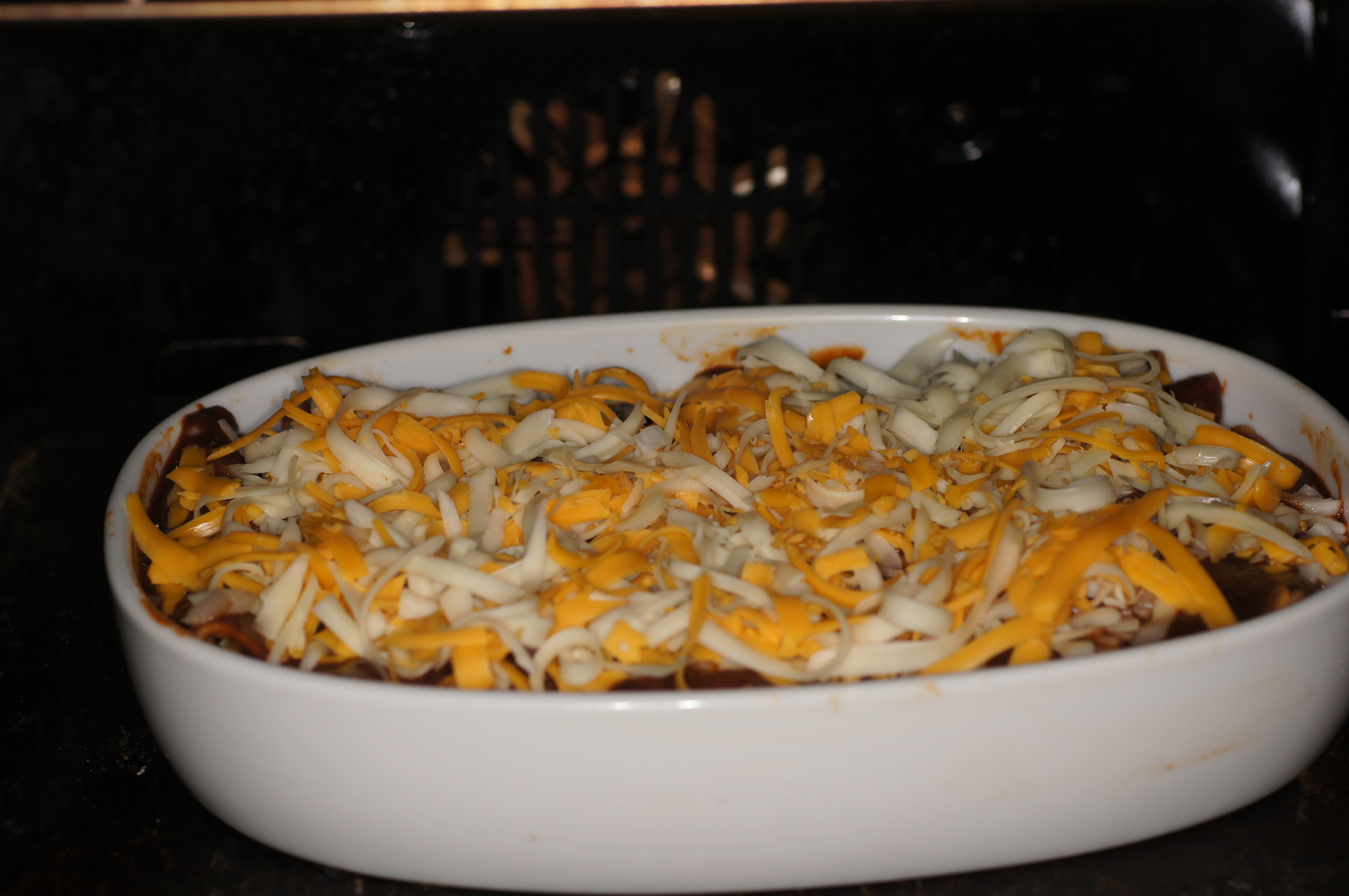 Place in a 350 F oven and cook for 30 minutes for cheese to melt and enchiladas to cook through.