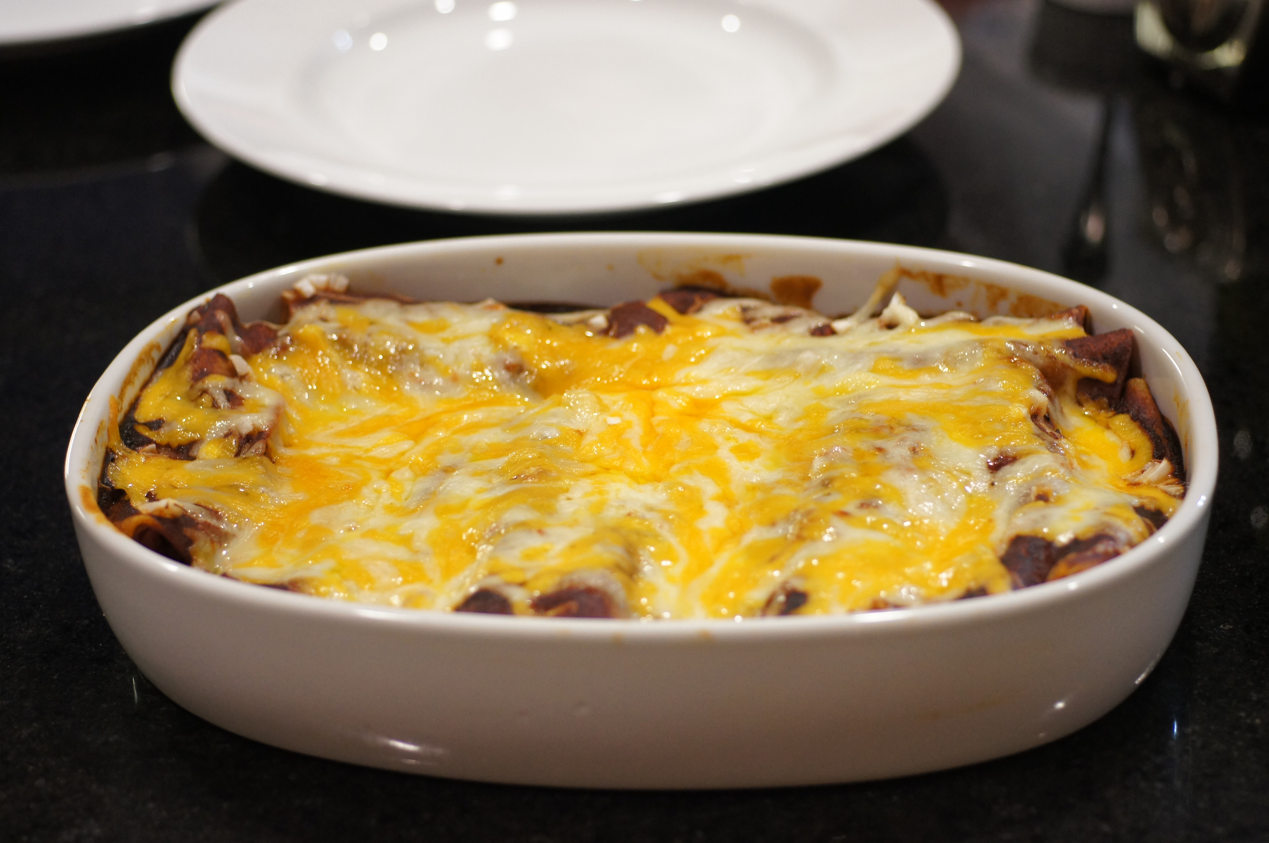 NOTES: As an option for serving, you can drizzle some sour cream over the top. The sour cream will add a nice sour but creamy bite to the enchiladas.