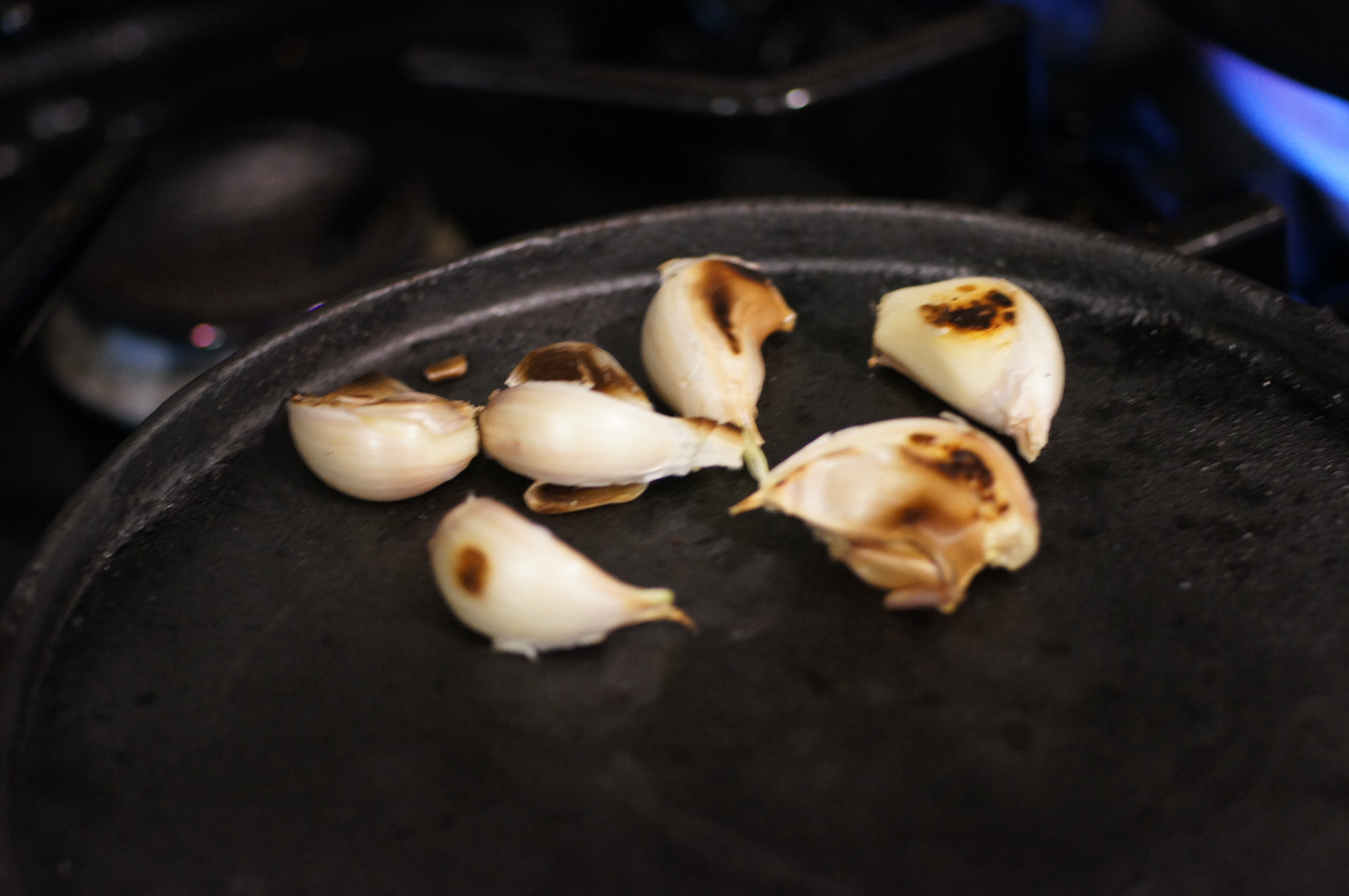 While you are toasting the chiles, you might as well toast the garlic by laying it on top of the comal as well. Be very careful not to burn the garlic. Keep an eye on it and turn it as needed. You want it soft and toasty, roughly 15 minutes.