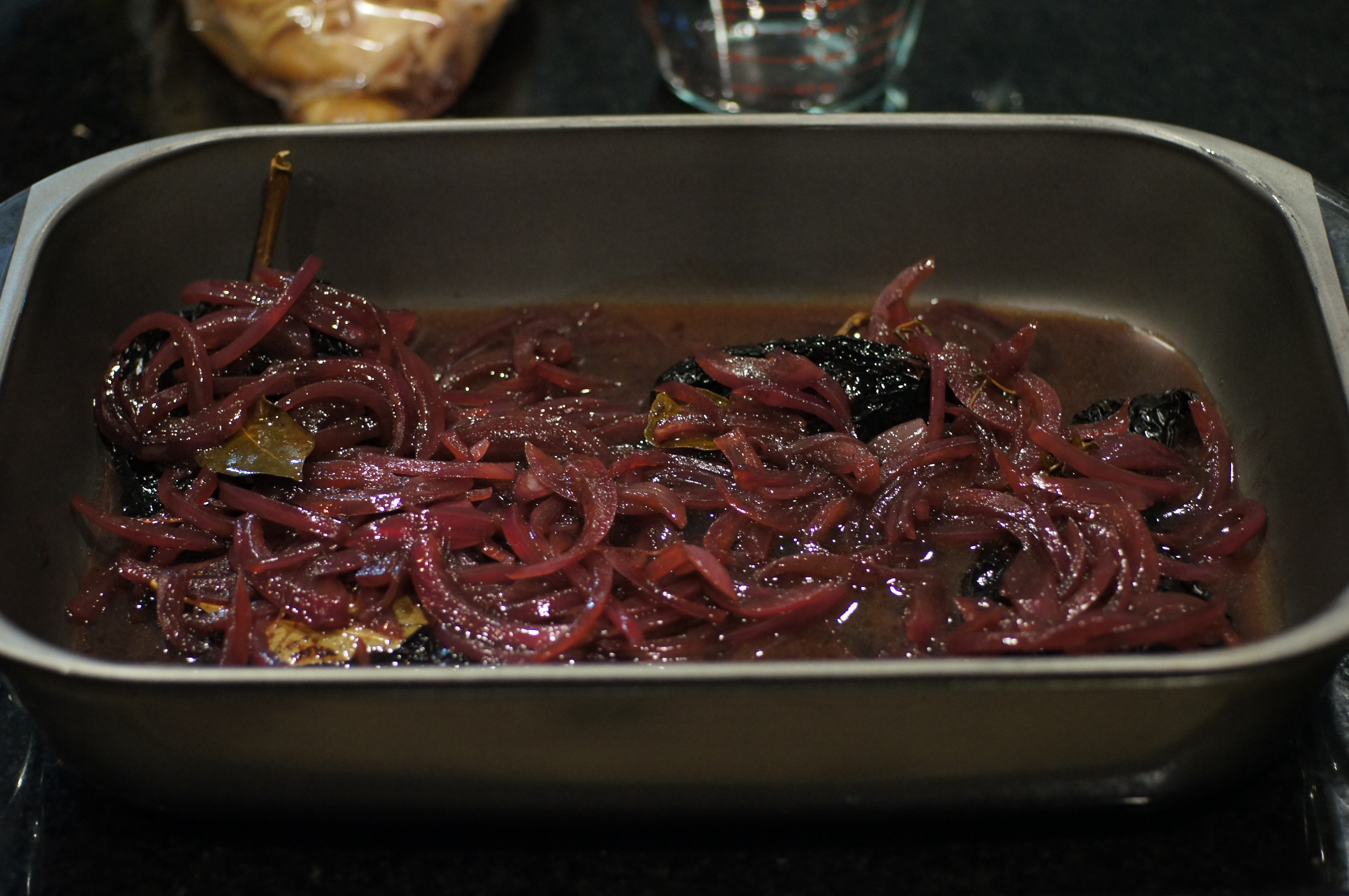 Place the toasted chiles in a baking dish and cover with the escabeche.