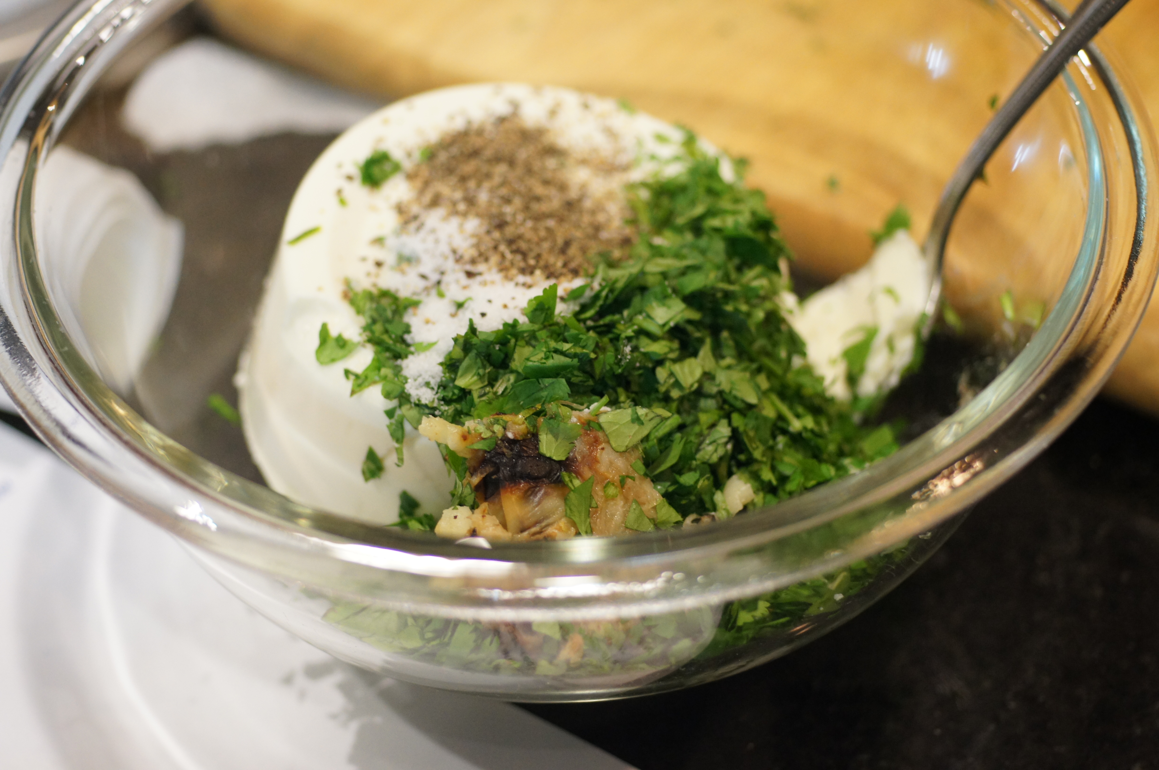 Prepare the filling. Cool, peel and mash the toasted garlic with a fork in a medium bowl. You want a coarse puree. Add the ricotta, cilantro 1/2 tsp sea salt and black pepper.