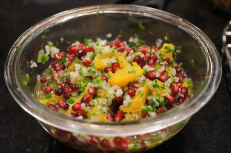 This recipe came about because I had picked a couple of the pomegranates and wanted to do something with them. We had some nice Minneola Tangelos in the refrigerator and some beautiful salmon. I didn’t want to glaze the salmon with the pomegranates because I wanted that little burst of flavor with each bite. We also did not want a salad. It was beautiful weather perfect for grilling so a salsa seemed the best way to go. This is what we did.