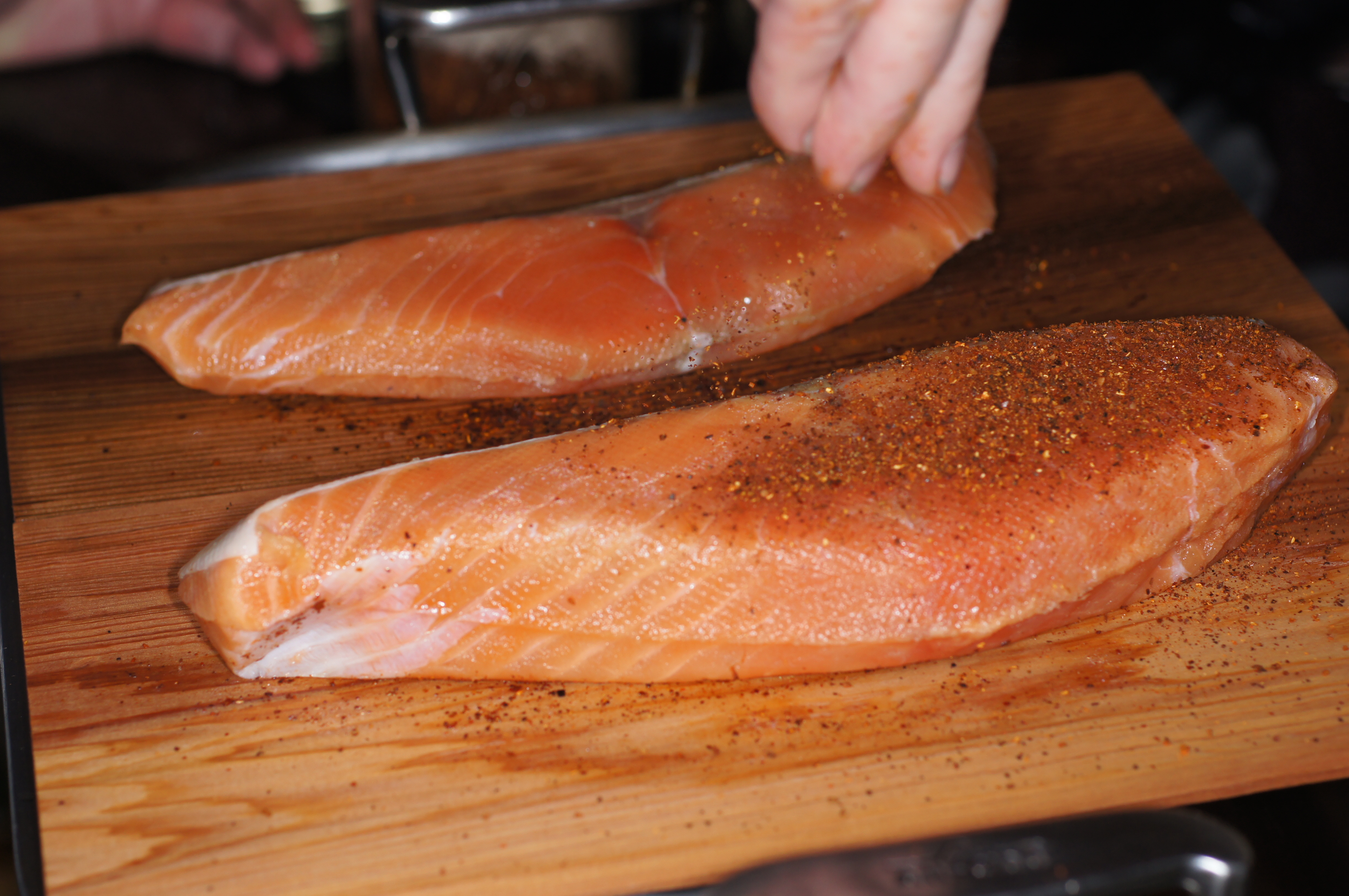 When ready to cook, place salmon filets on cedar planks and season them with ancho chile rub.