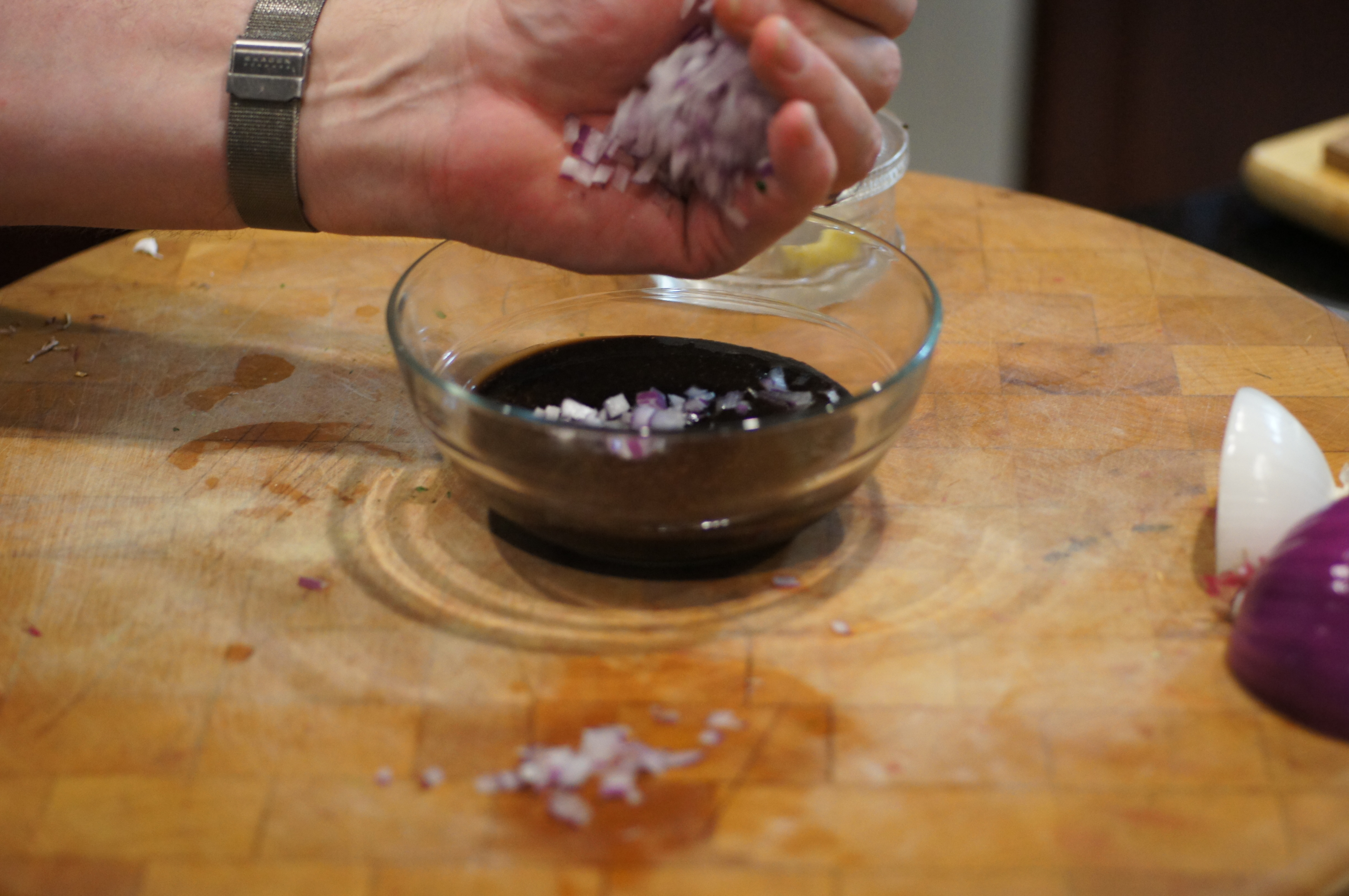Pour the oil & vinegar into a bowl. Add the diced onion