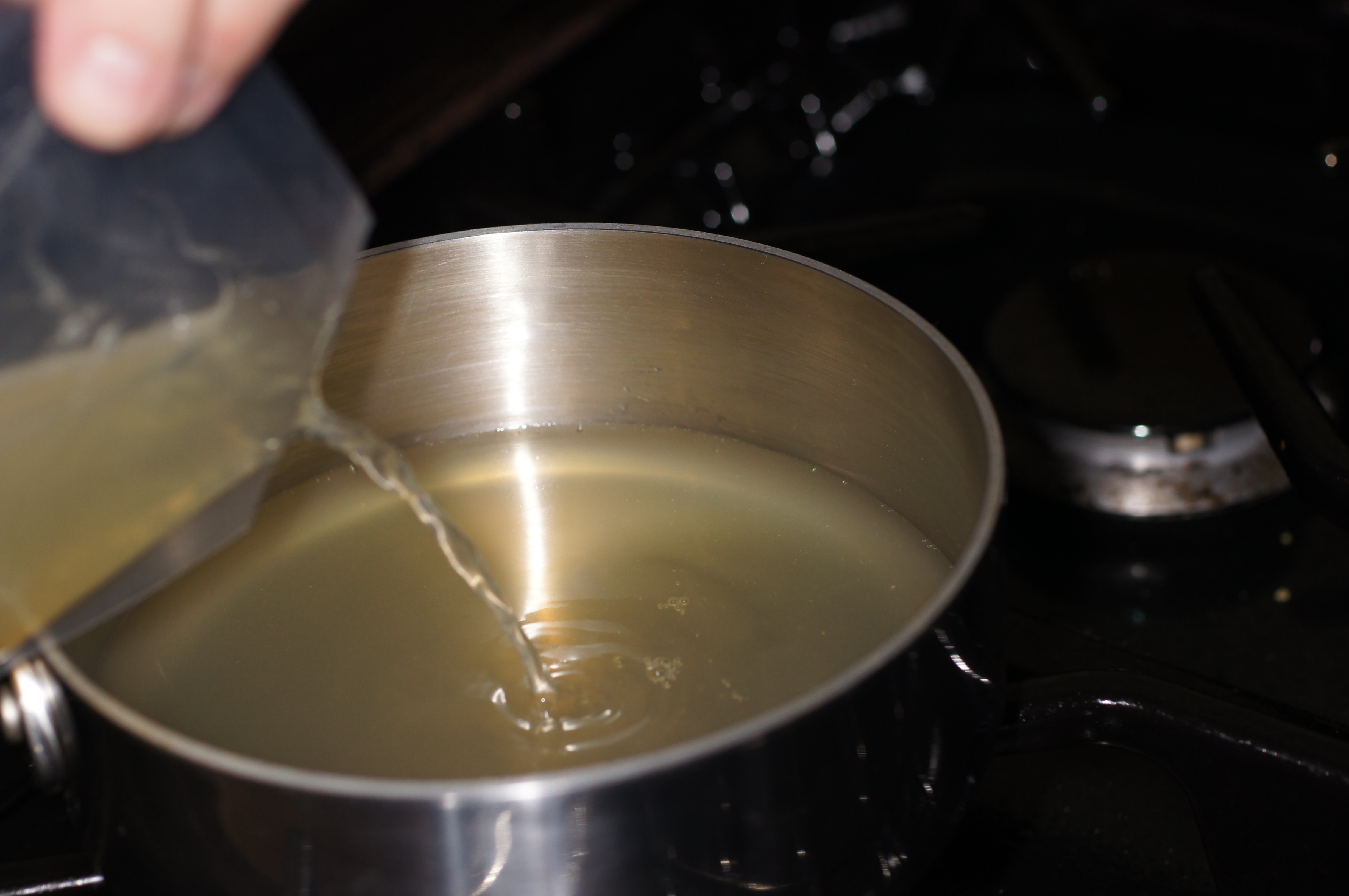 Add 1 cup of chicken stock to a small saucepan over medium-high heat.