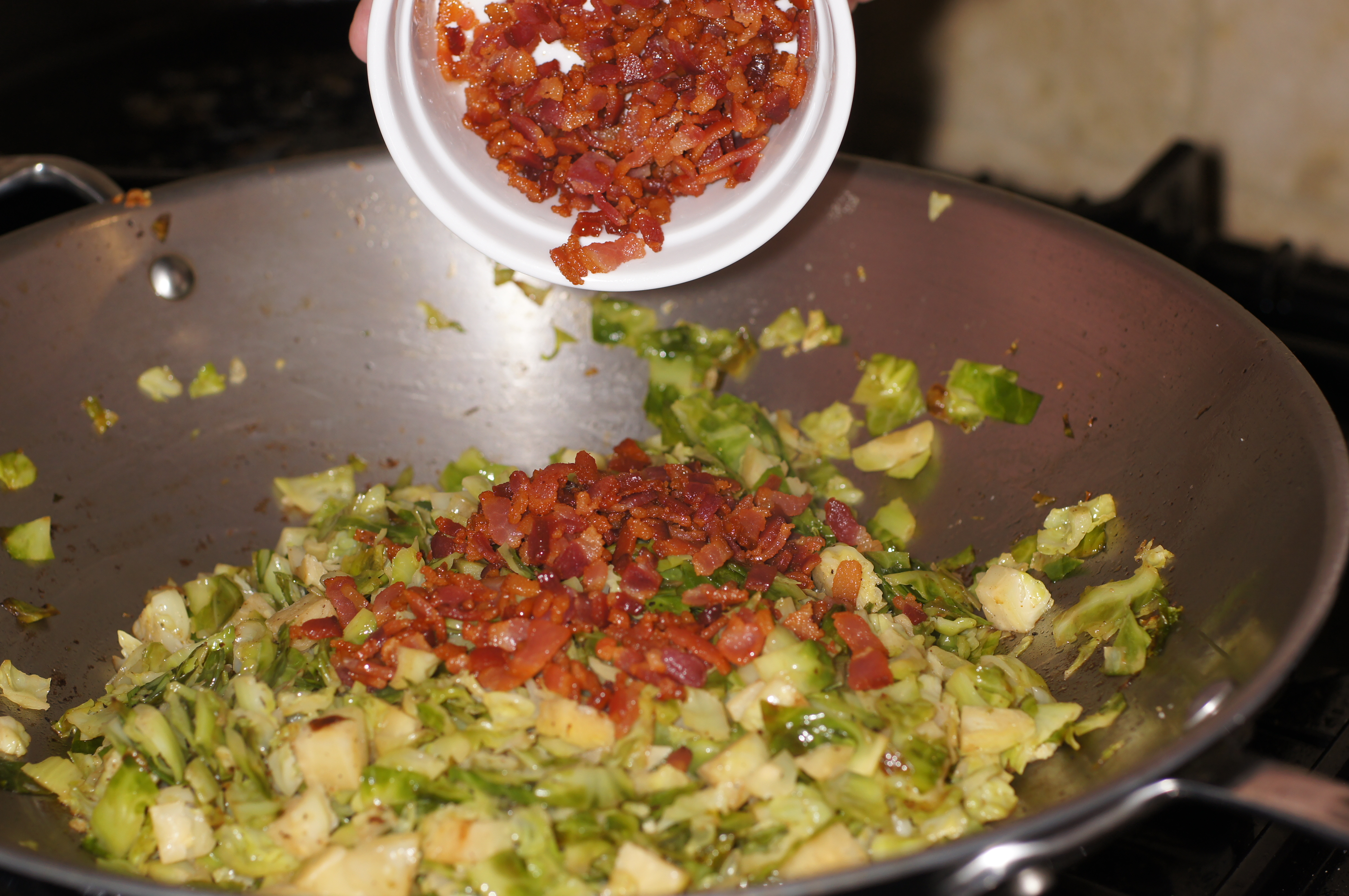 Reduce heat to medium-low and steam brussel sprouts for 6 minutes. When tender but still nicely green, add the bacon