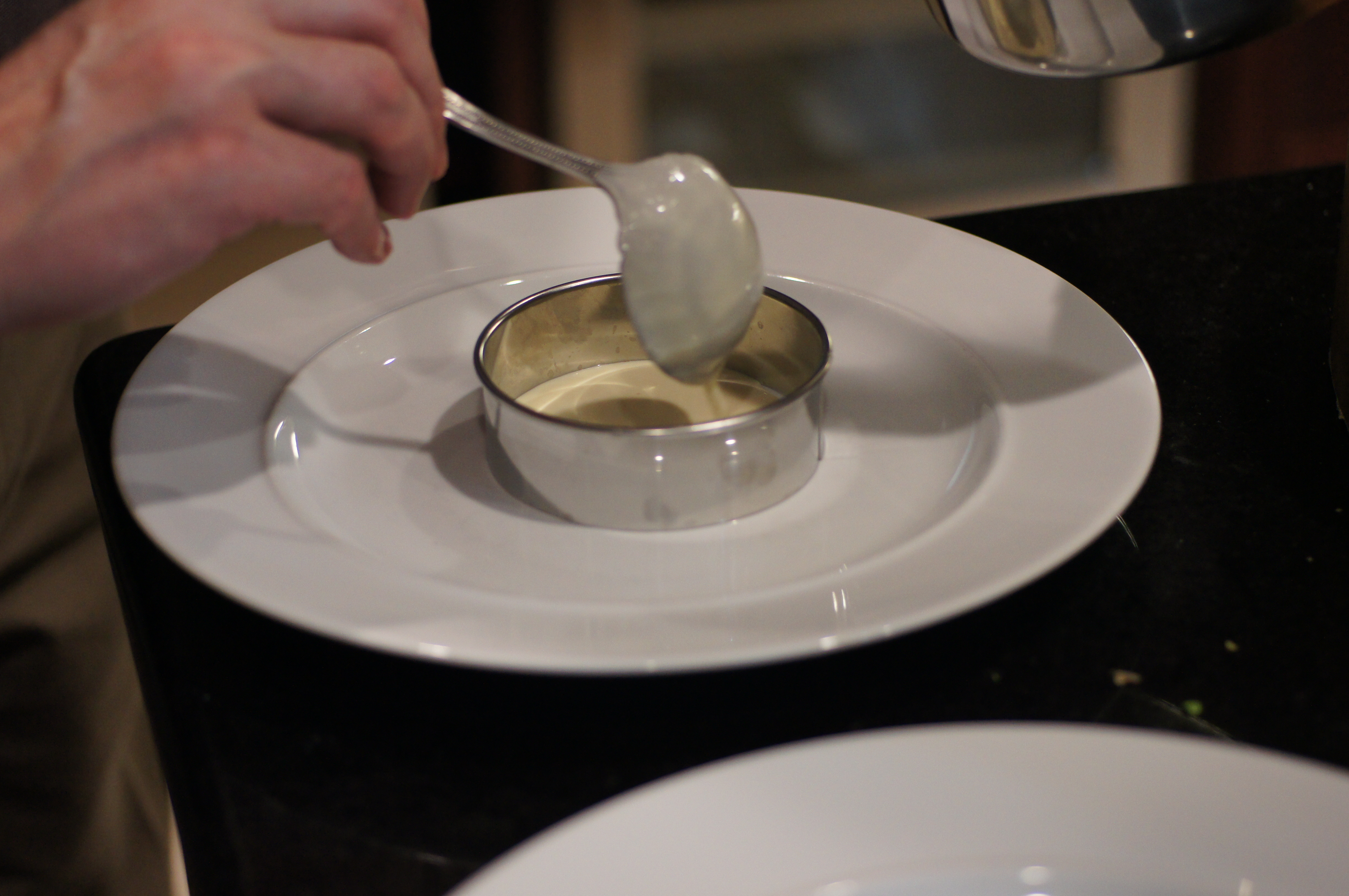 Place a 4 inch ring mold in the middle of a plate. Spoon sauce into ring mold filling bottom