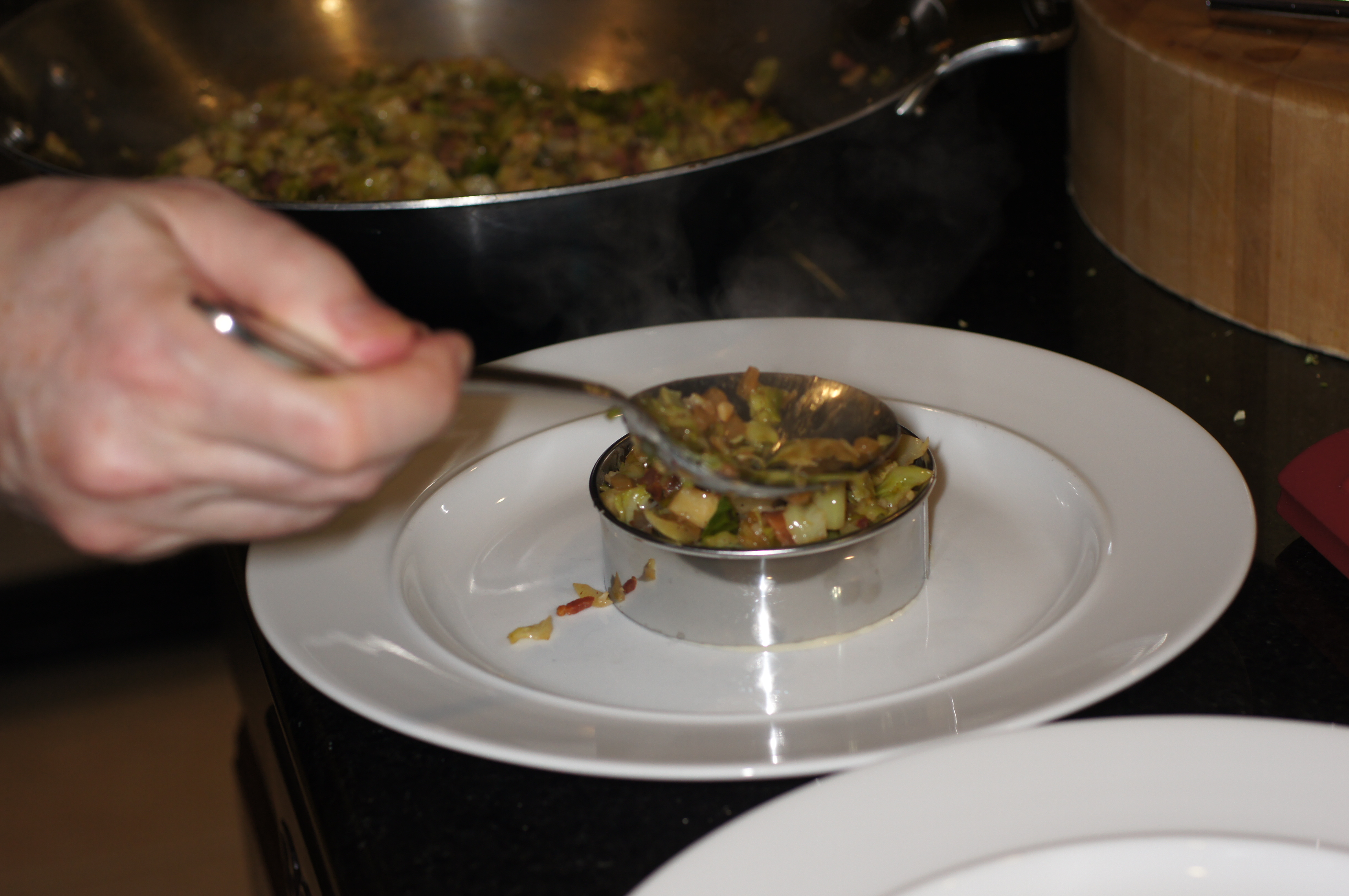 Spoon brussel sprout hash into ring mold filling it completely