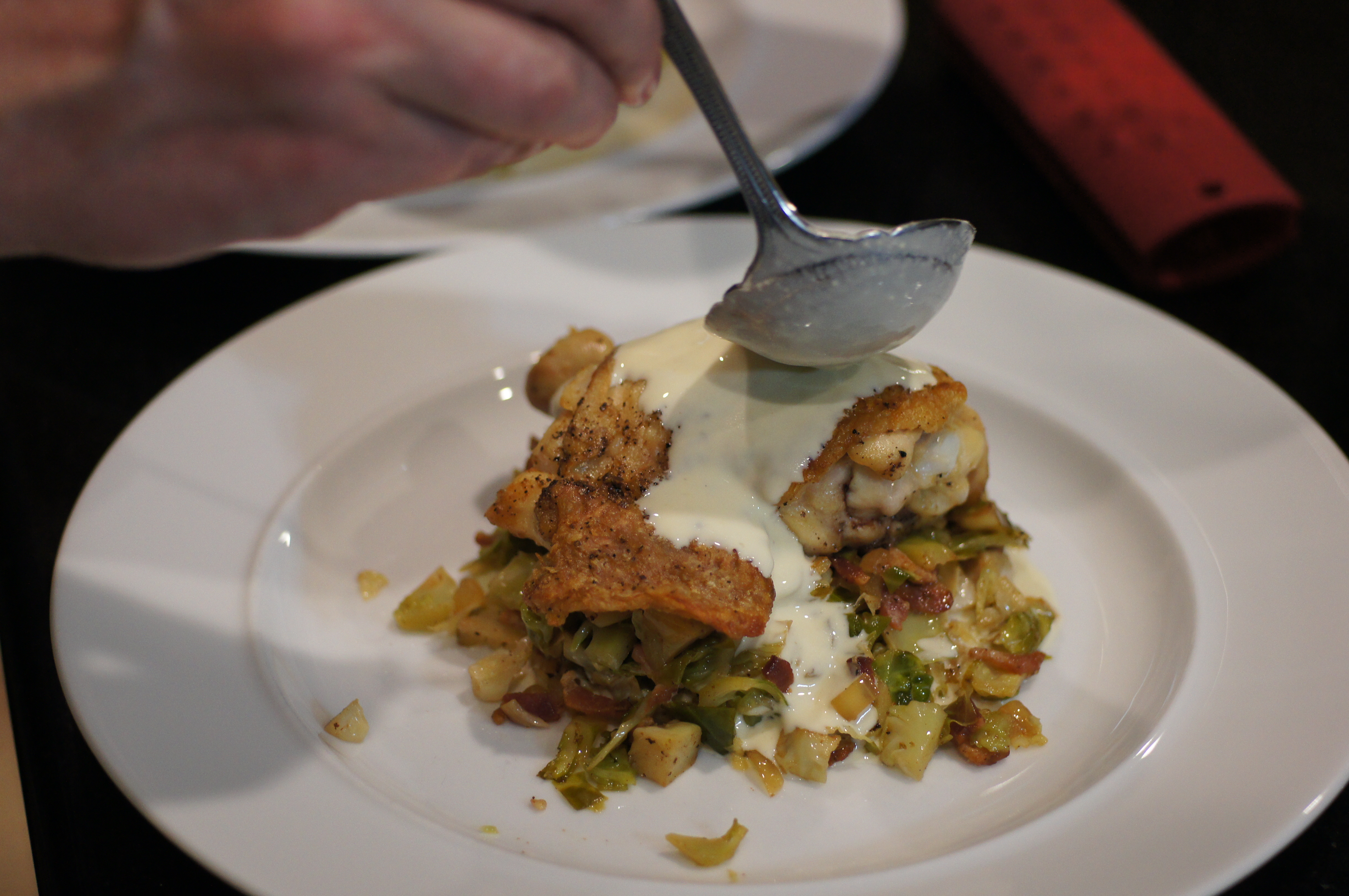 I love brussels sprouts, this veggie most people stay away from but with bacon I am done.Richard you just made it extra special with crispy chicken skin and mustard sauce!
