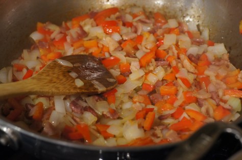 Add lardons to a skillet over medium heat and cook for a couple of minutes to render some of the fat. Now, add diced onion, red bell pepper and garlic.