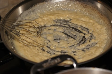 Now because the roux is hot and the cream is cold, the roux will begin to thicken almost immediately. This is where the problem came with too much roux and too little liquid.