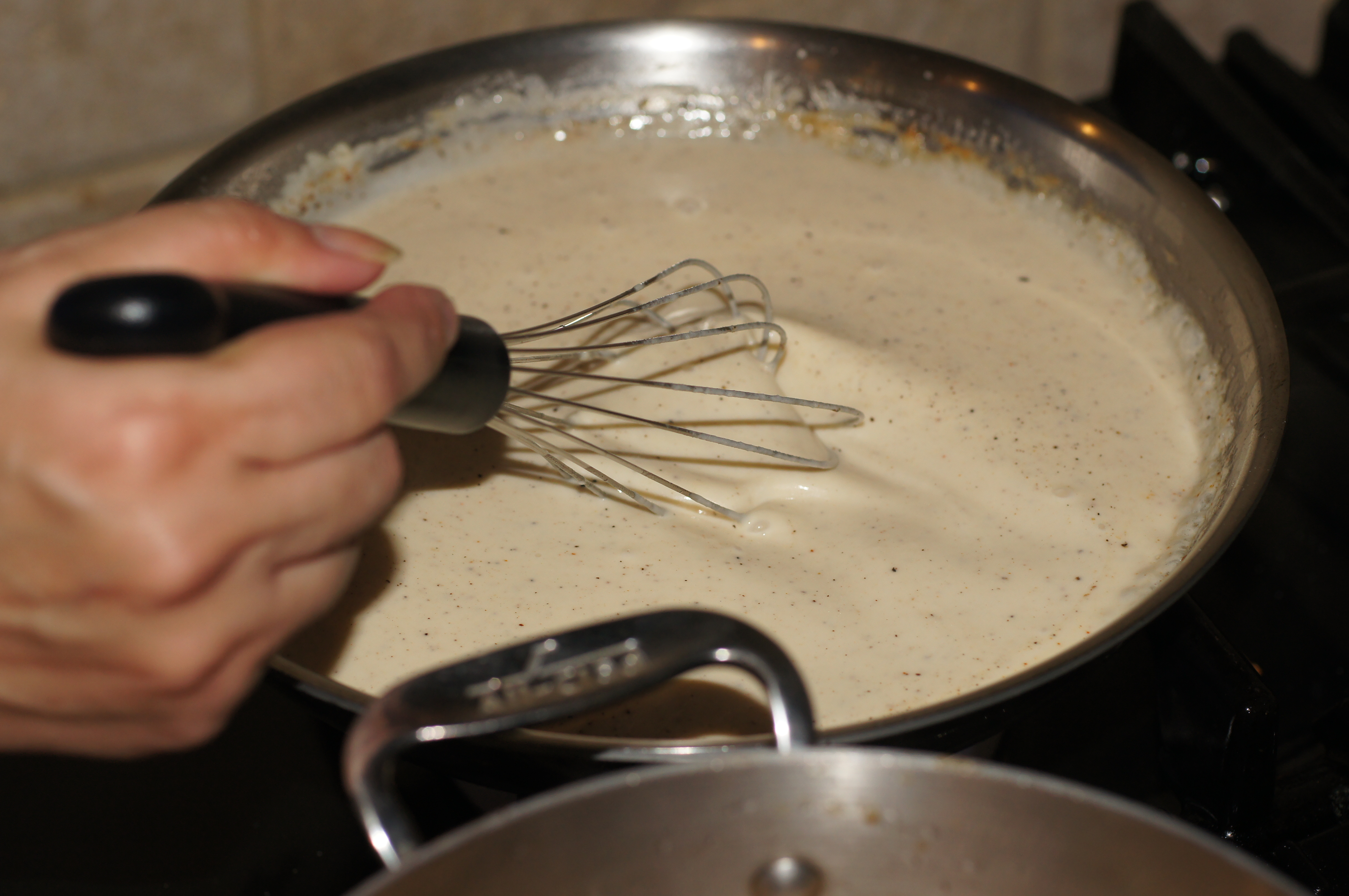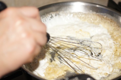 When the roux begins to give off a nutty aroma, the flour has started to cook. Add the cream whisking constantly to incorporate the cream and roux evenly. This is simply making a béchamel sauce, one of the 4 mother sauces.