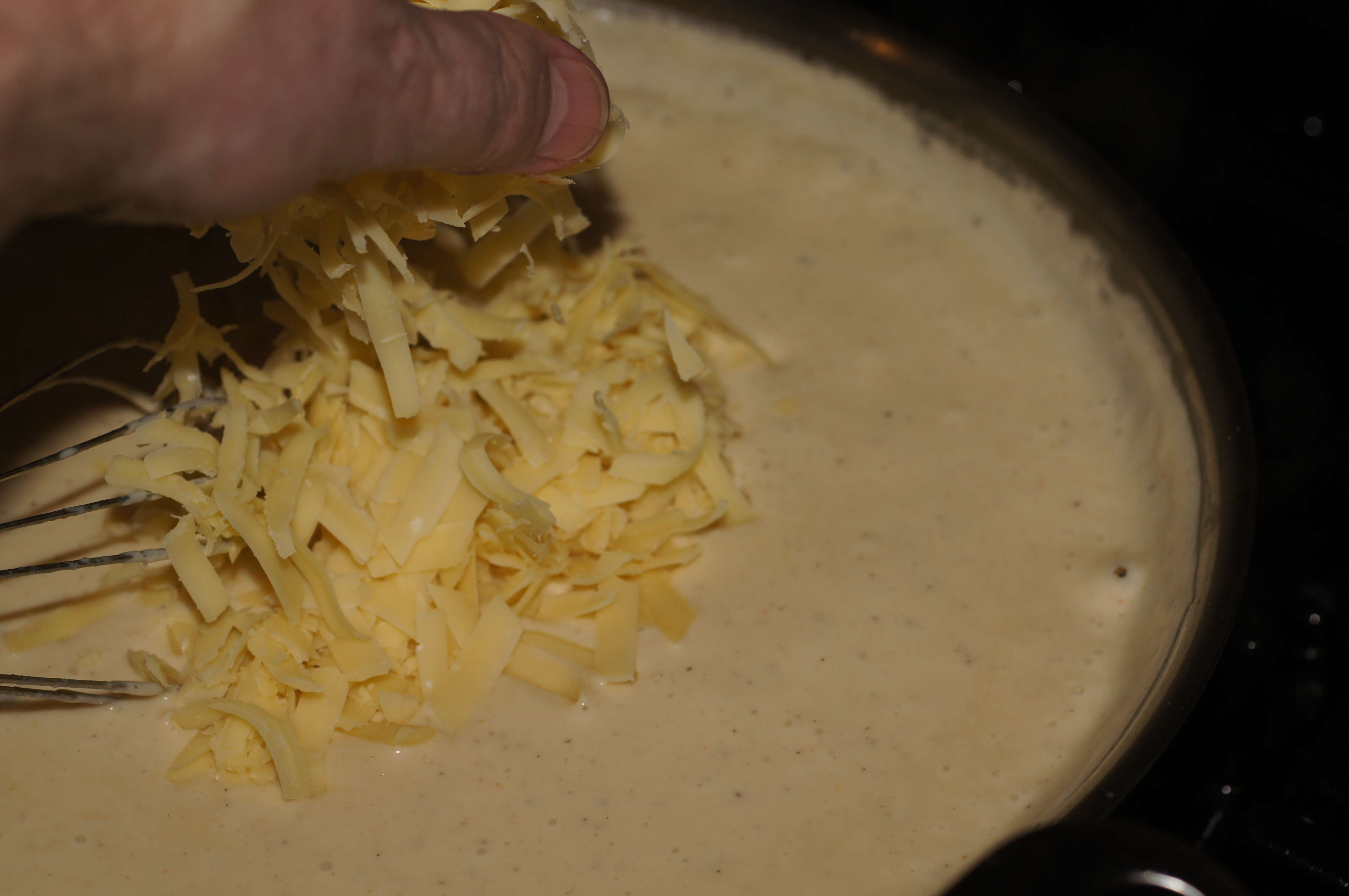 Cook for a few minutes to let the flour cook out and remove the flour taste from the sauce. Now, add salt, pepper, ground chipotle and the grated cheddar. Reduce heat to low and whisk to allow the cheese to melt.