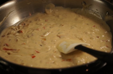 See how the roux absorbed all of the cream creating a gloppy mess? Because cream is thick to start with, it will take a lot more cream to thin this out which would cause the casserole to be too creamy. The solution was to add 2 more cups of turkey stock whisking constantly to avoid having lumps. This resulted in a smooth creamy, flavorful base sauce.
