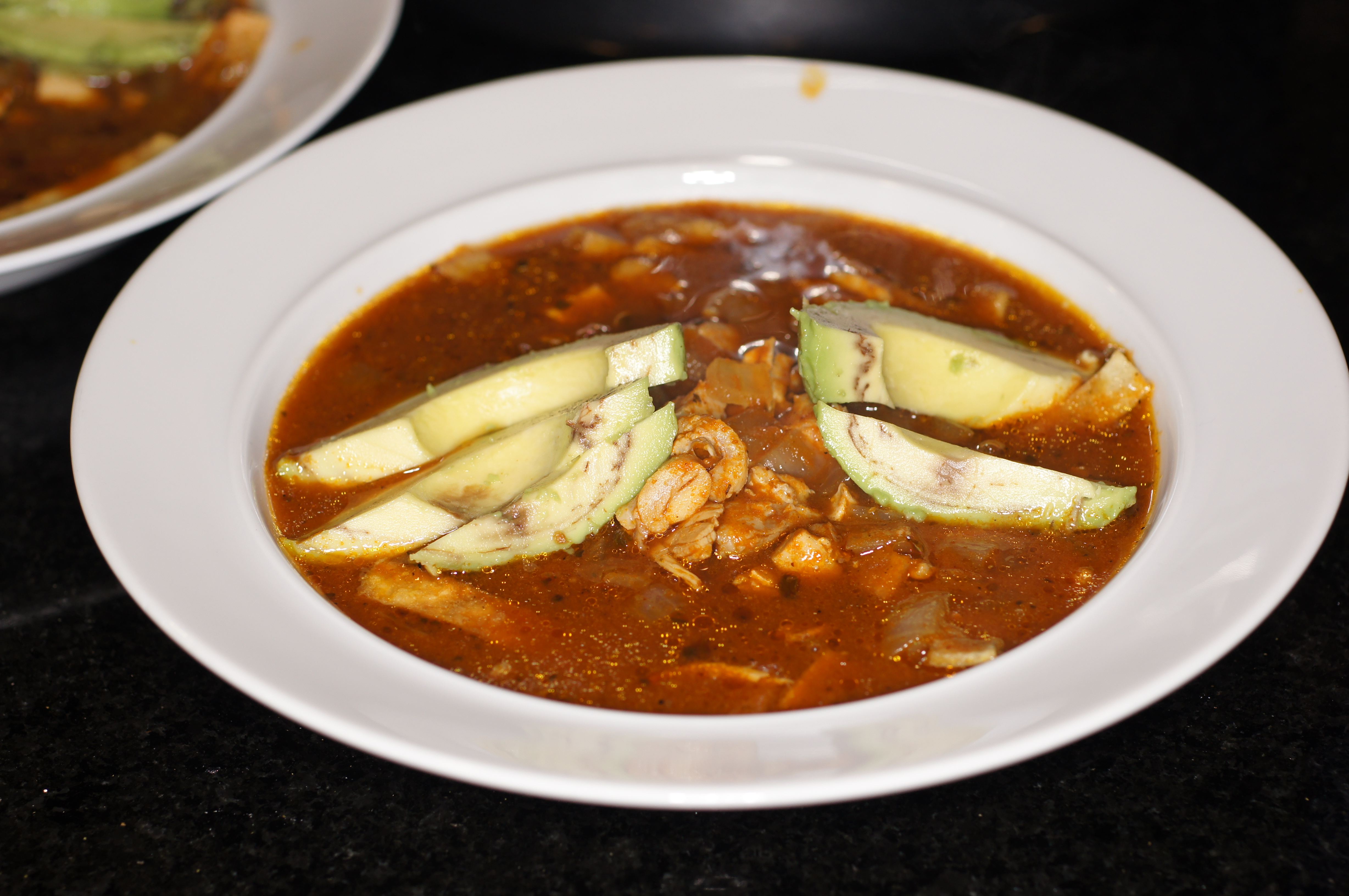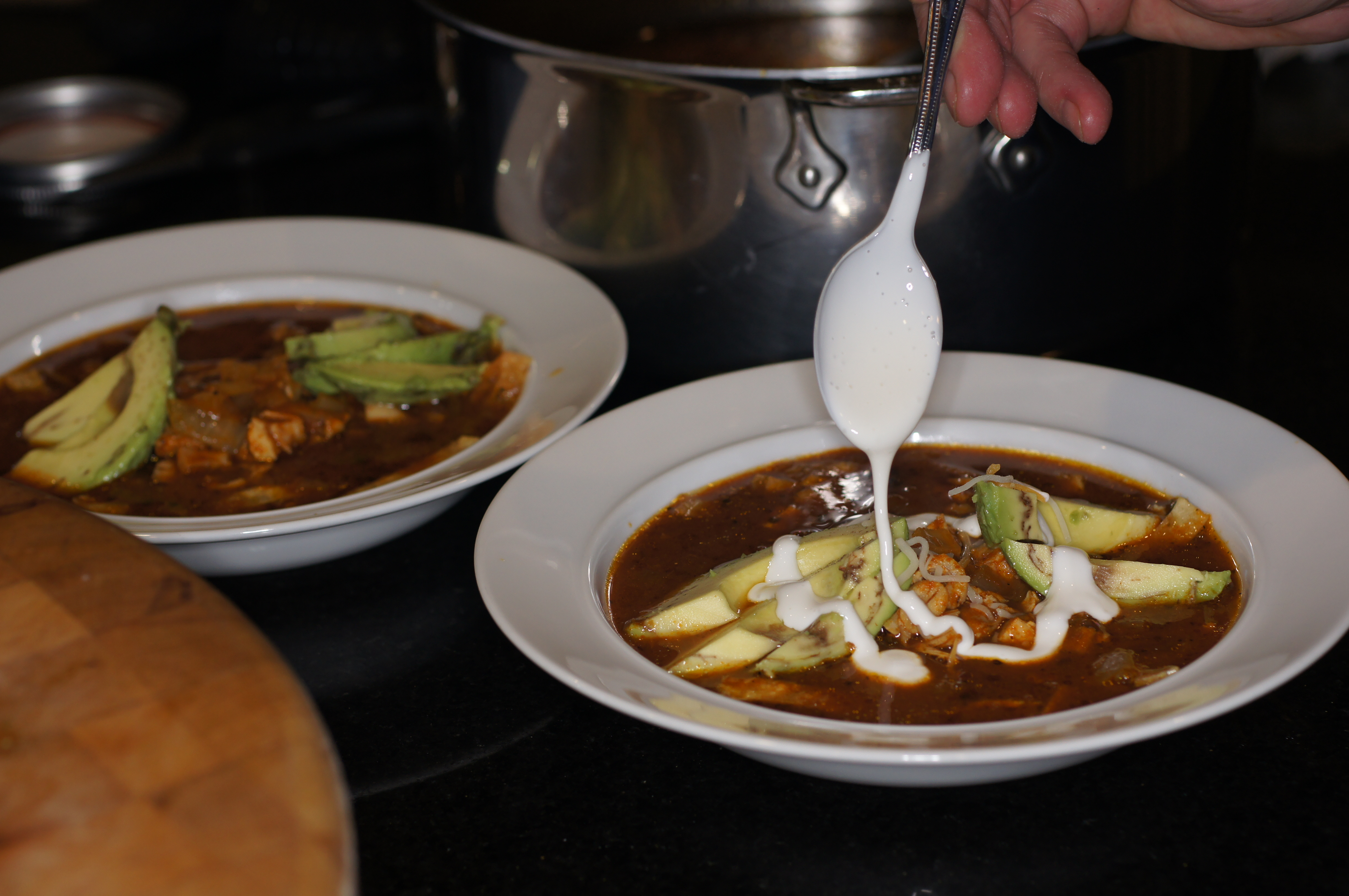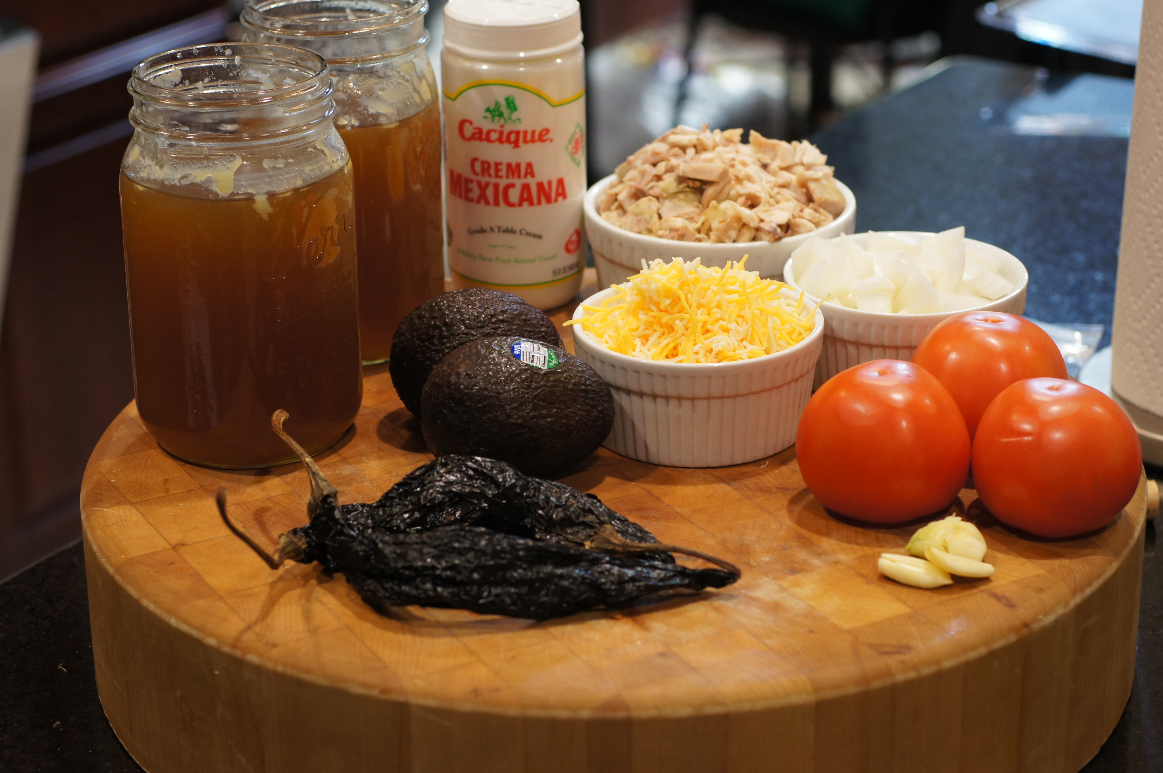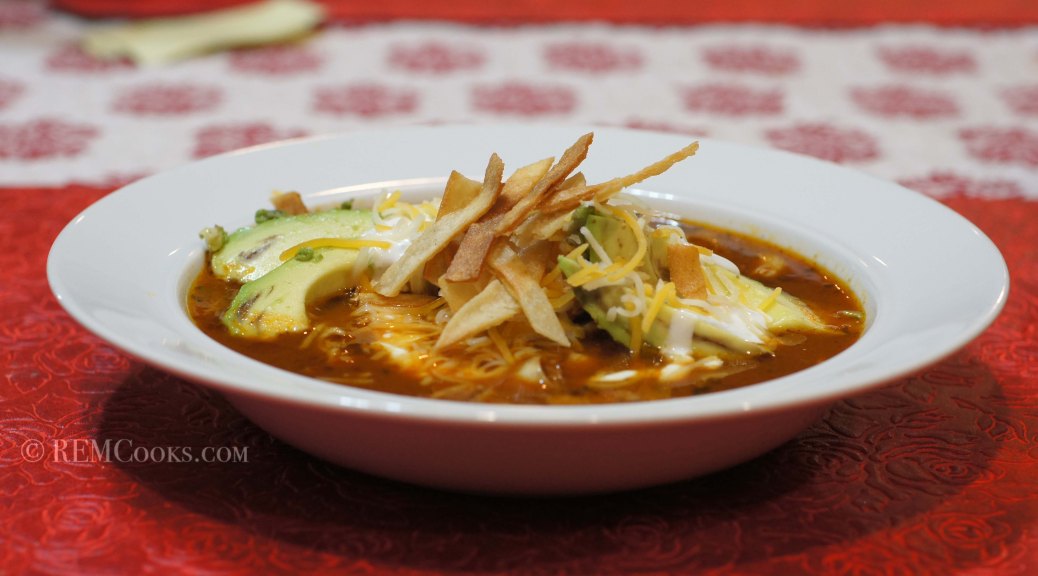 It’s still cold in DFW so we’re still doing soups. We also need to lose the weight we gained during the Holidays. 😮 So, we roasted 3 chickens, obtained 5.5 lbs of shredded chicken meat, took the carcasses and made 7 qts of rich chicken stock. When you do that you know there is some soup in there somewhere. With that much chicken meat and stock you can make a wonderful variety of soups, starting with your standard comfort food – Chicken Noodle Soup. Today, however, it was time for a good old stick to your bones mexican soup, Tortilla Soup (Sopa Aztea de Tortilla) that is.