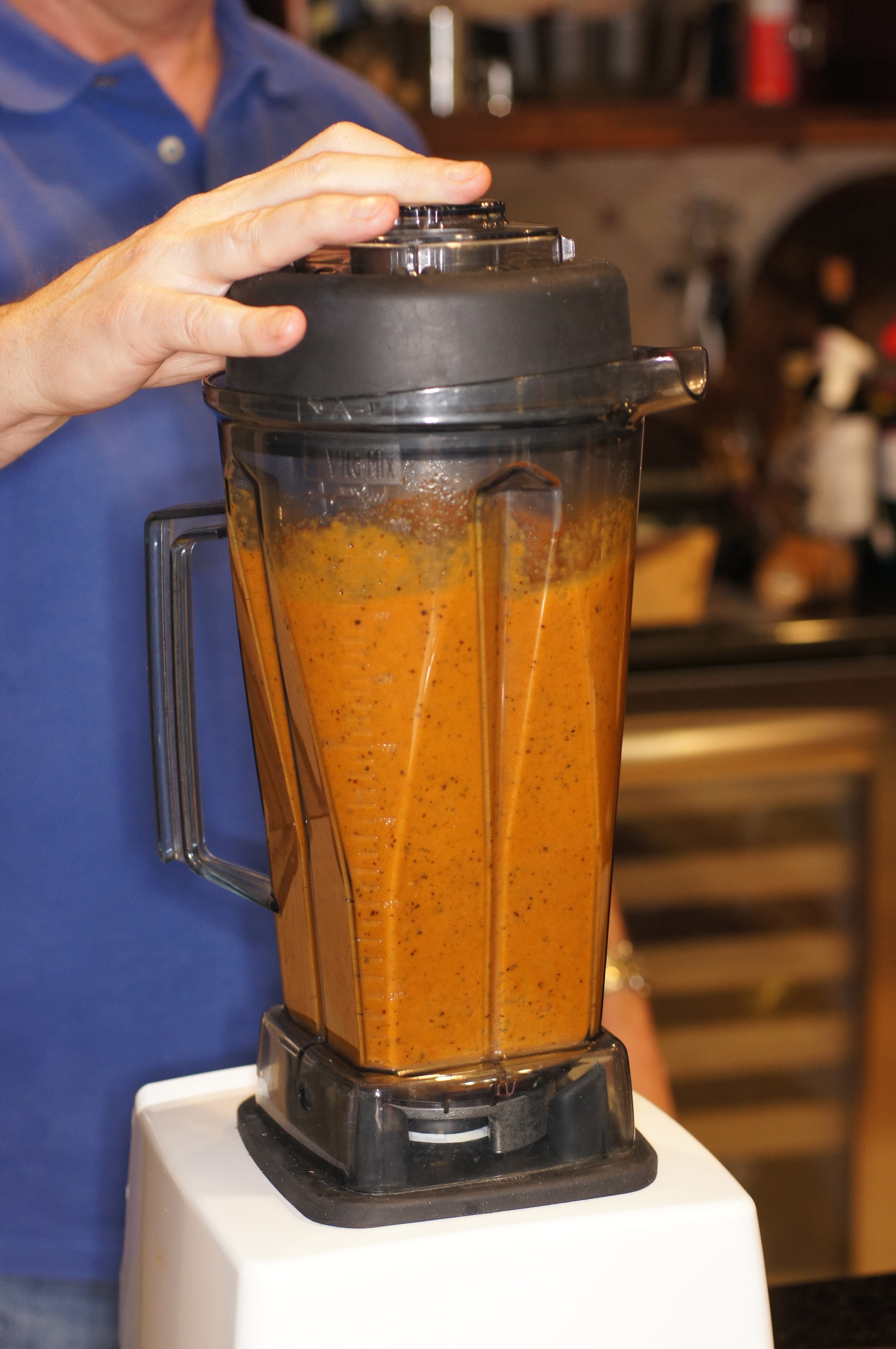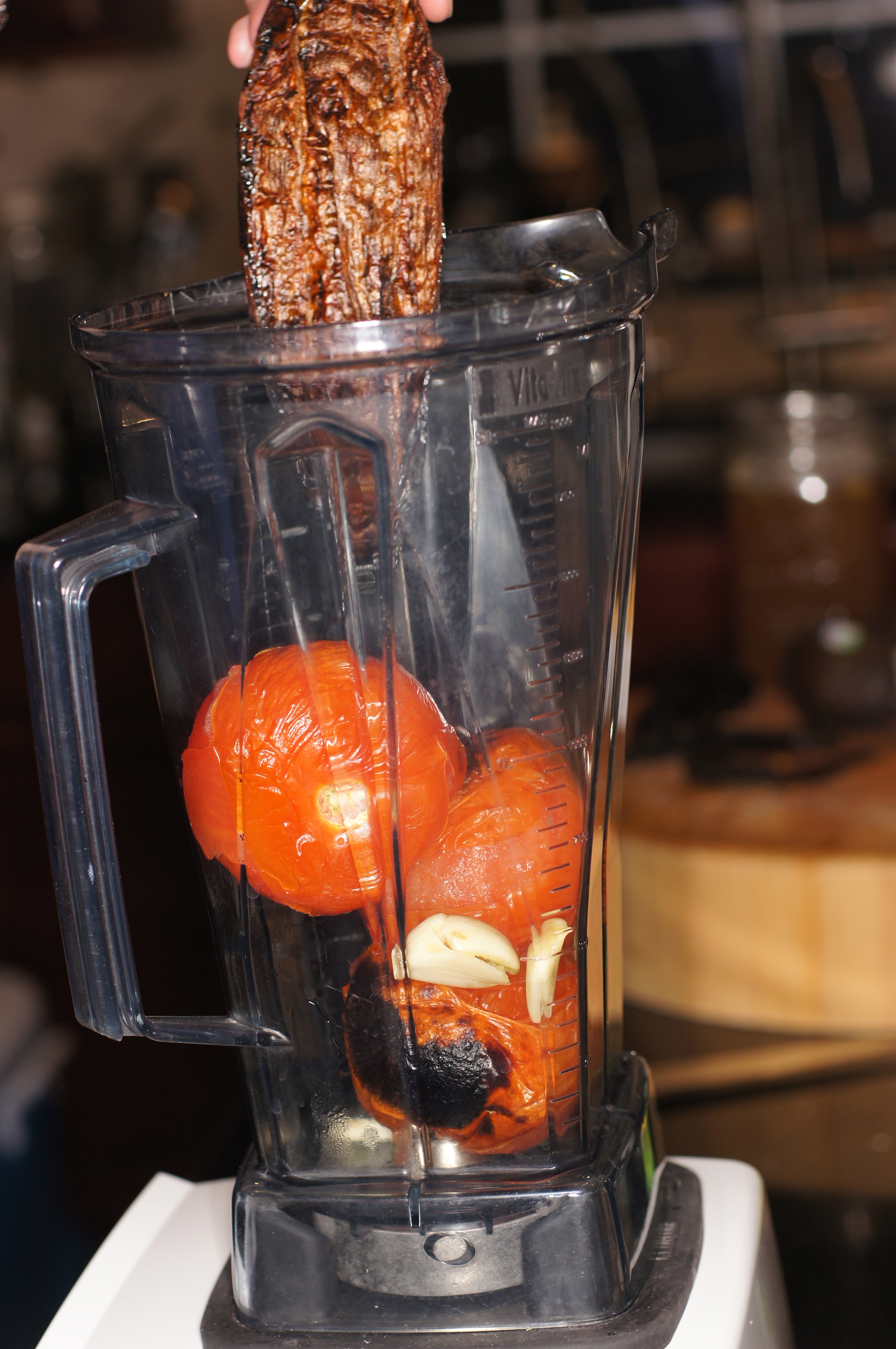 Put the tomatoes, chiles, garlic and 2 cups chicken stock in the Vita-Mix.