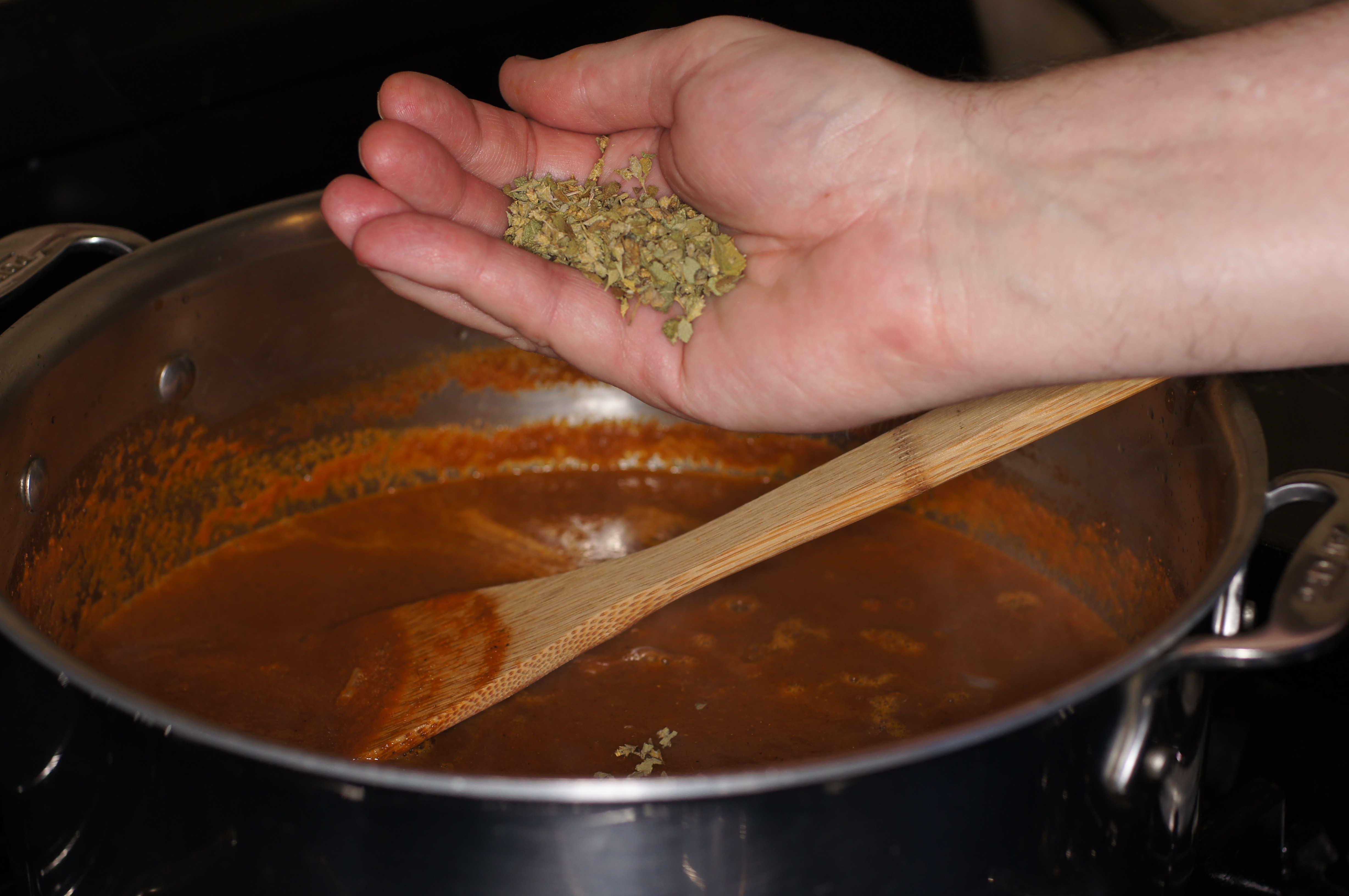 Cook over medium-high heat to blend flavors and reduce the puree to a thick consistency, roughly 8 – 10 minutes. Now add the remaining 6 cups of chicken stock and meat.