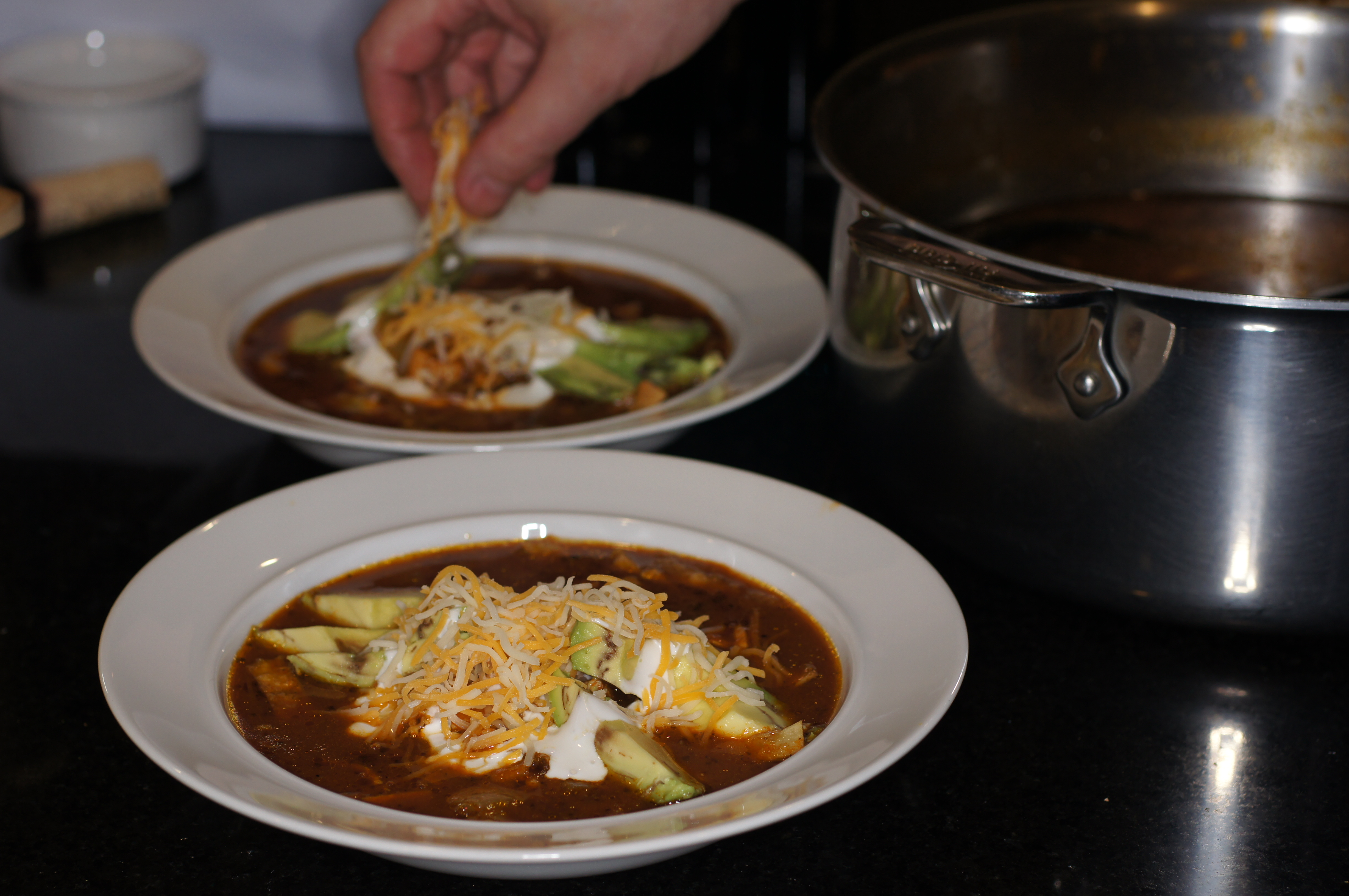If you haven’t noticed before, there are so many different recipes for tortilla soup. It seems like everywhere you go there is a different recipe. Some people make chicken soup topped with sour cream, fried tortillas, diced tomatoes and diced avocados. Others claim their authentic recipe includes shredded lettuce and green chiles. Still others use ancho chiles and chipotle in adobo. Rick Bayless’ famous Topolobampo has a recipe for tortilla soup using low fat chicken broth and chile powder. Well this is my recipe for Tortilla Soup. Unlike the authentic tortilla soup, I don’t fry my chiles and crumble them into the soup at the end. Instead, like others, I prefer to make a chile paste. I believe the chile paste provides greater depth of flavor. It’s all in your preference. This is mine. Give this a try. We hope you like it.
