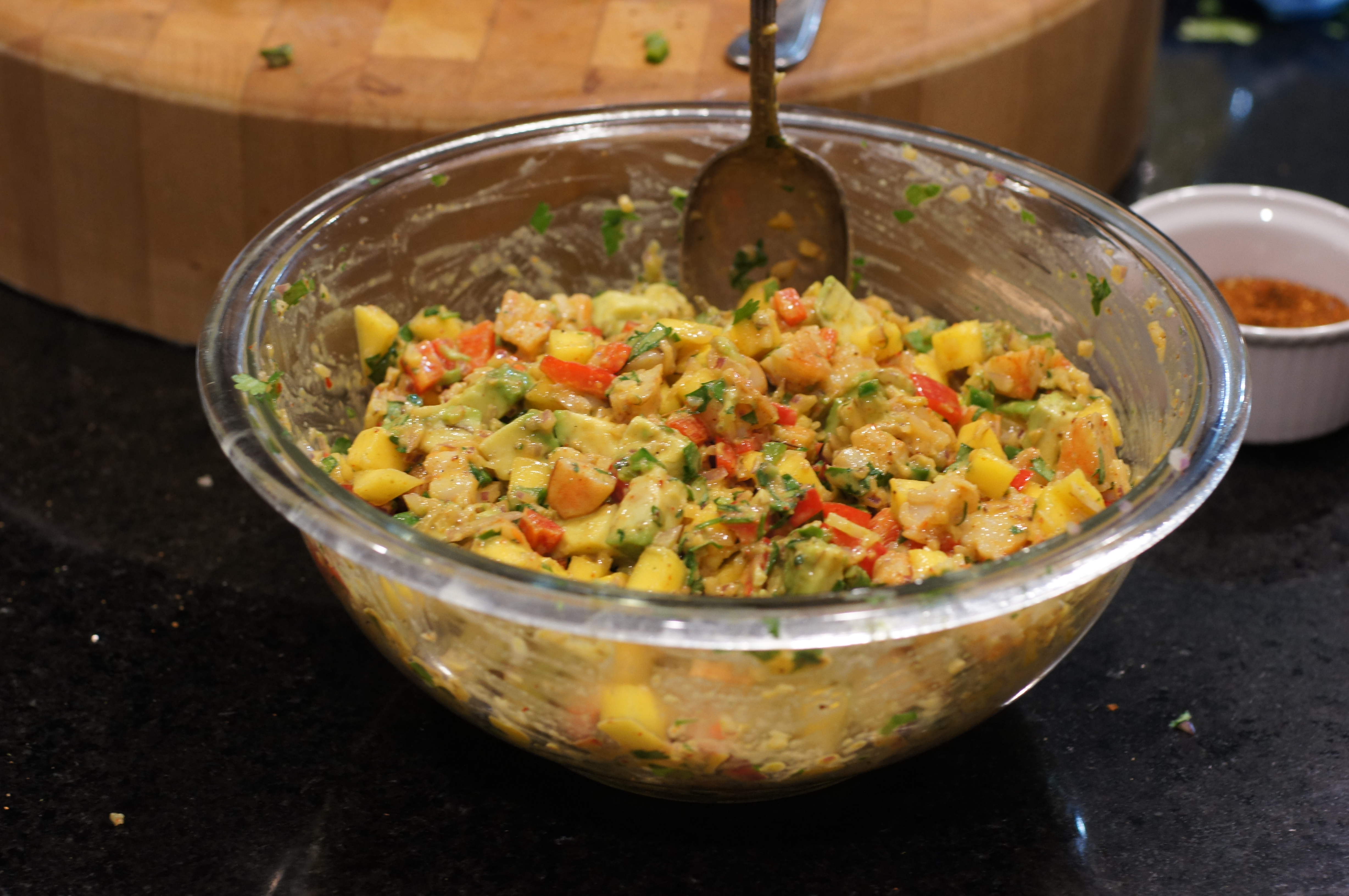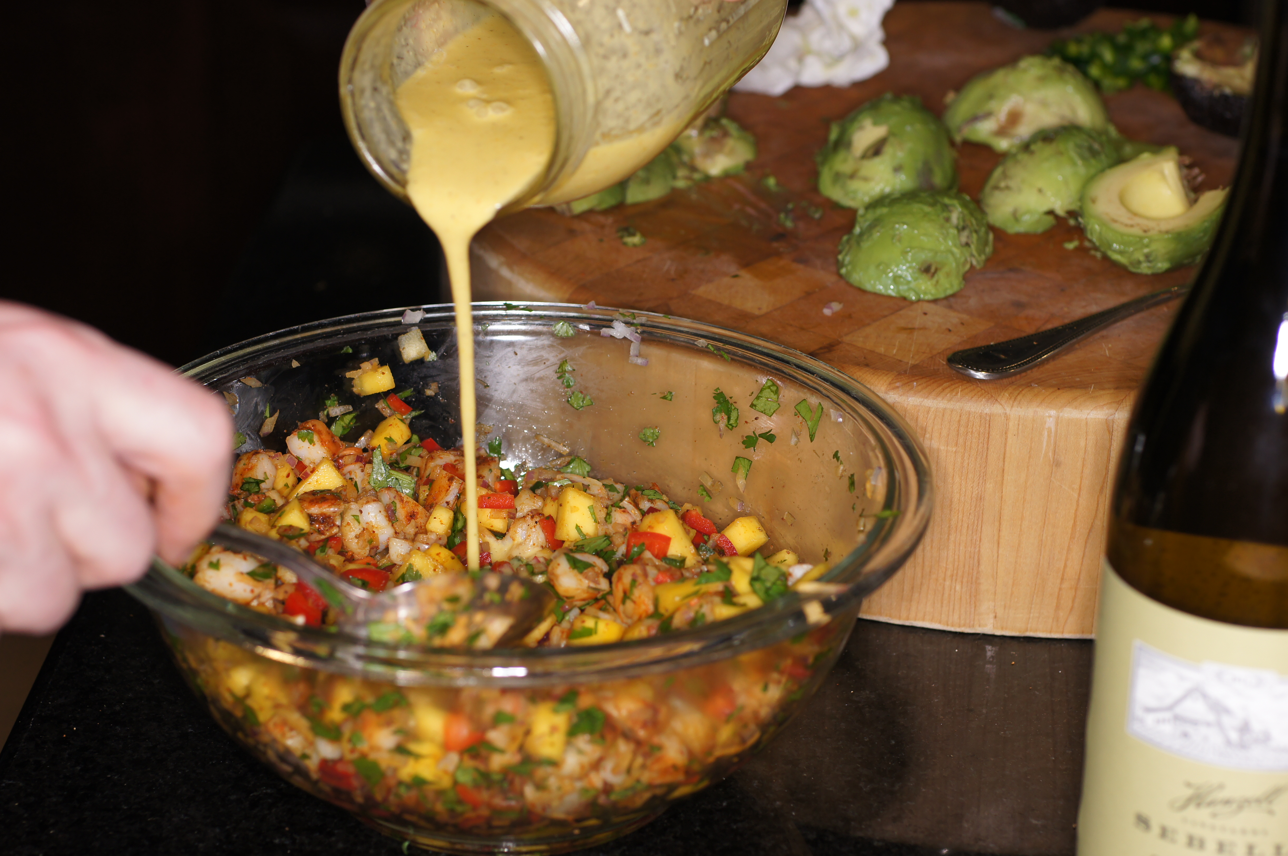 They are so big, full of juice and mildly sweet. Inasmuch as we had these beautiful Meyer lemons, avocados, shrimp, a beautiful red mango, and oranges, a salad was definitely in order. This salad is full of fresh flavors with differing textures to tantalize your taste buds while keeping you healthy. It’s a wonderful salad that makes the perfect lunch. It also works well for an appetizer, just adjust the portion size. Of course, if you’re still young and can eat everything in sight, don’t worry about adjusting the portion size. 🙂 Whether as a nice lunch, light dinner or as an appetizer this is a delicious salad we hope you try.