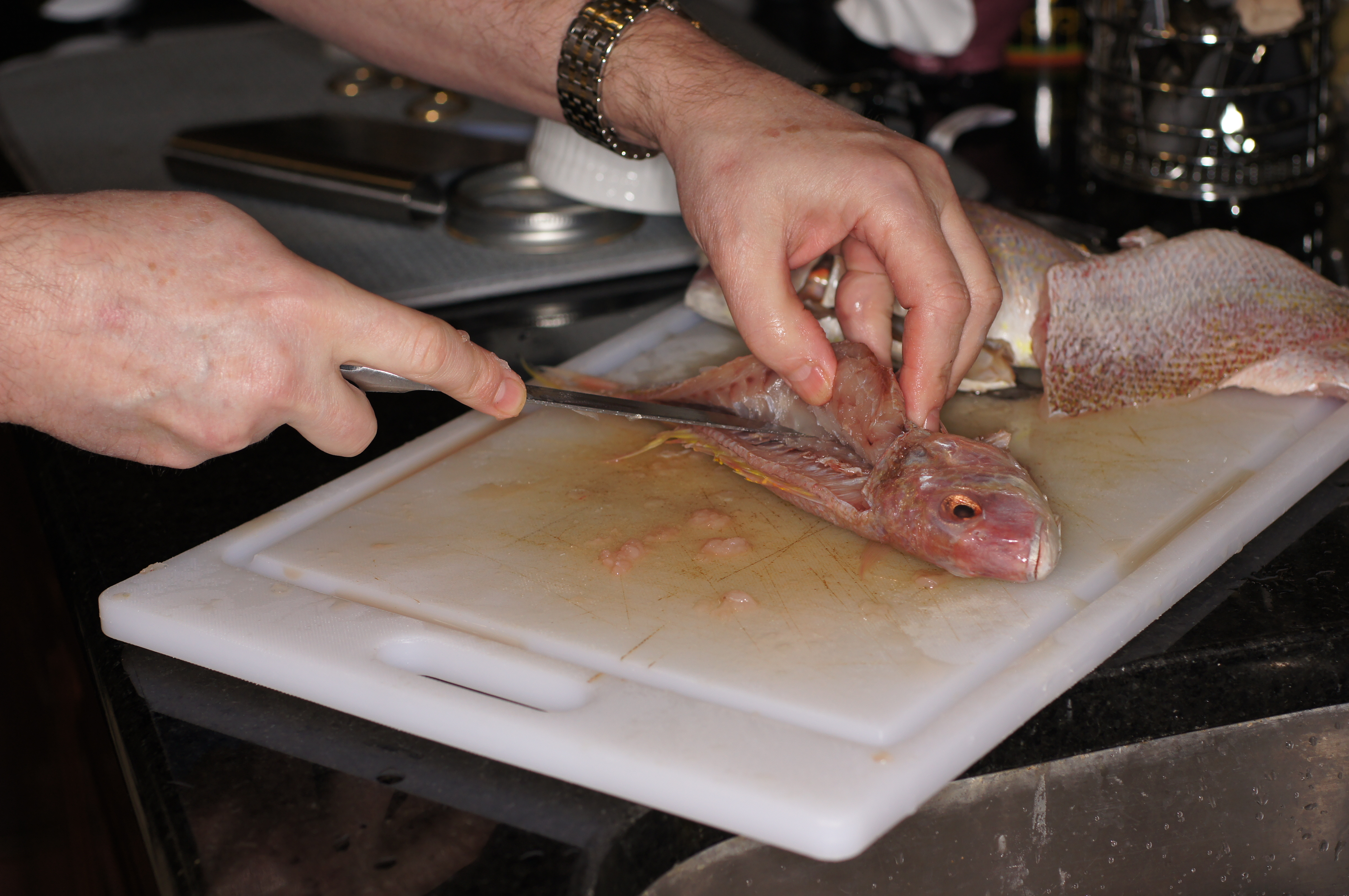 Either have your fishmonger clean, gut and scale the fish for you or do it yourself. While he is at it, he can also filet the fish for you, too. Just save the heads and bones. I chose to filet my own fish because I like the way I do it better. 🙂