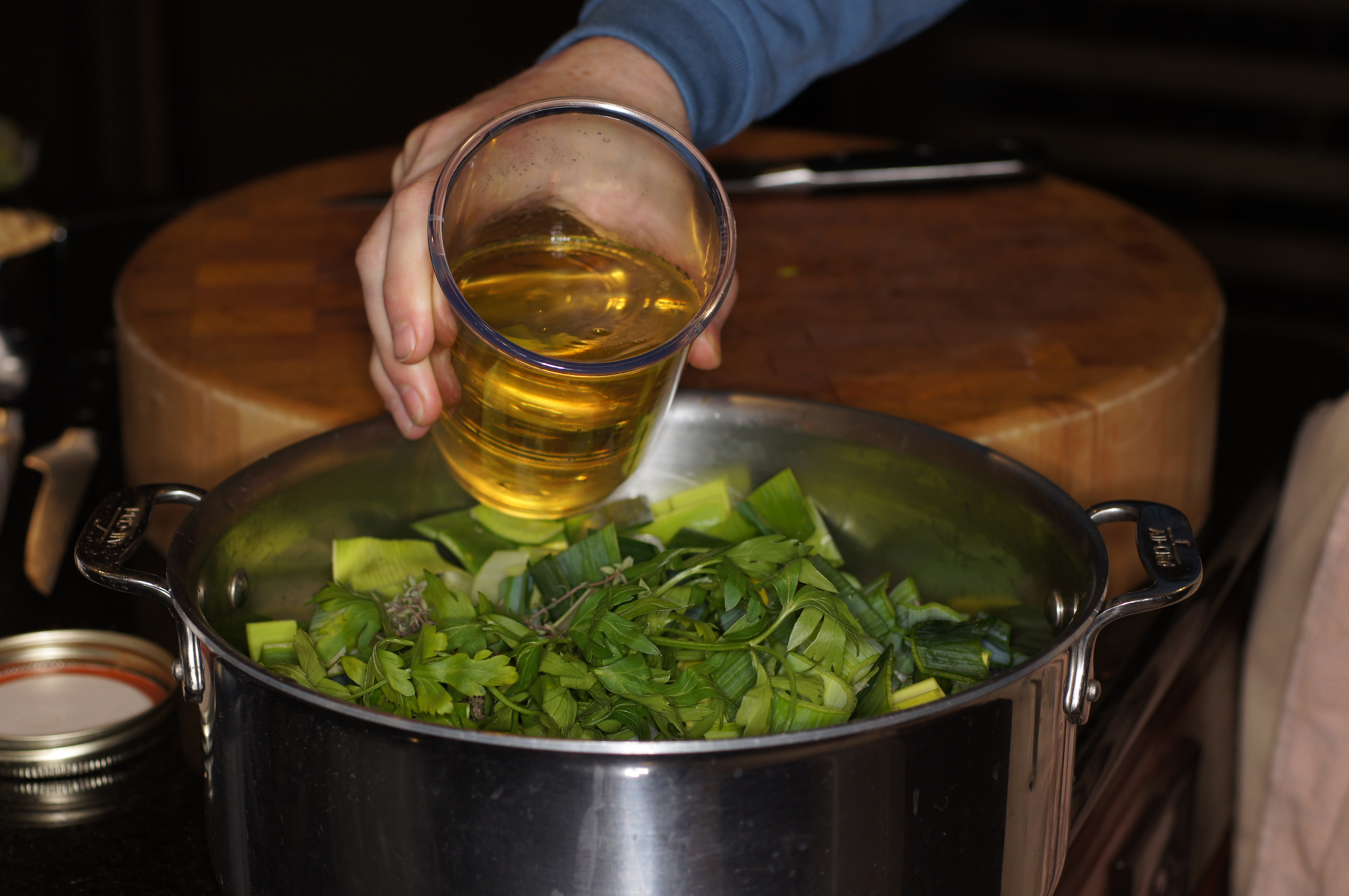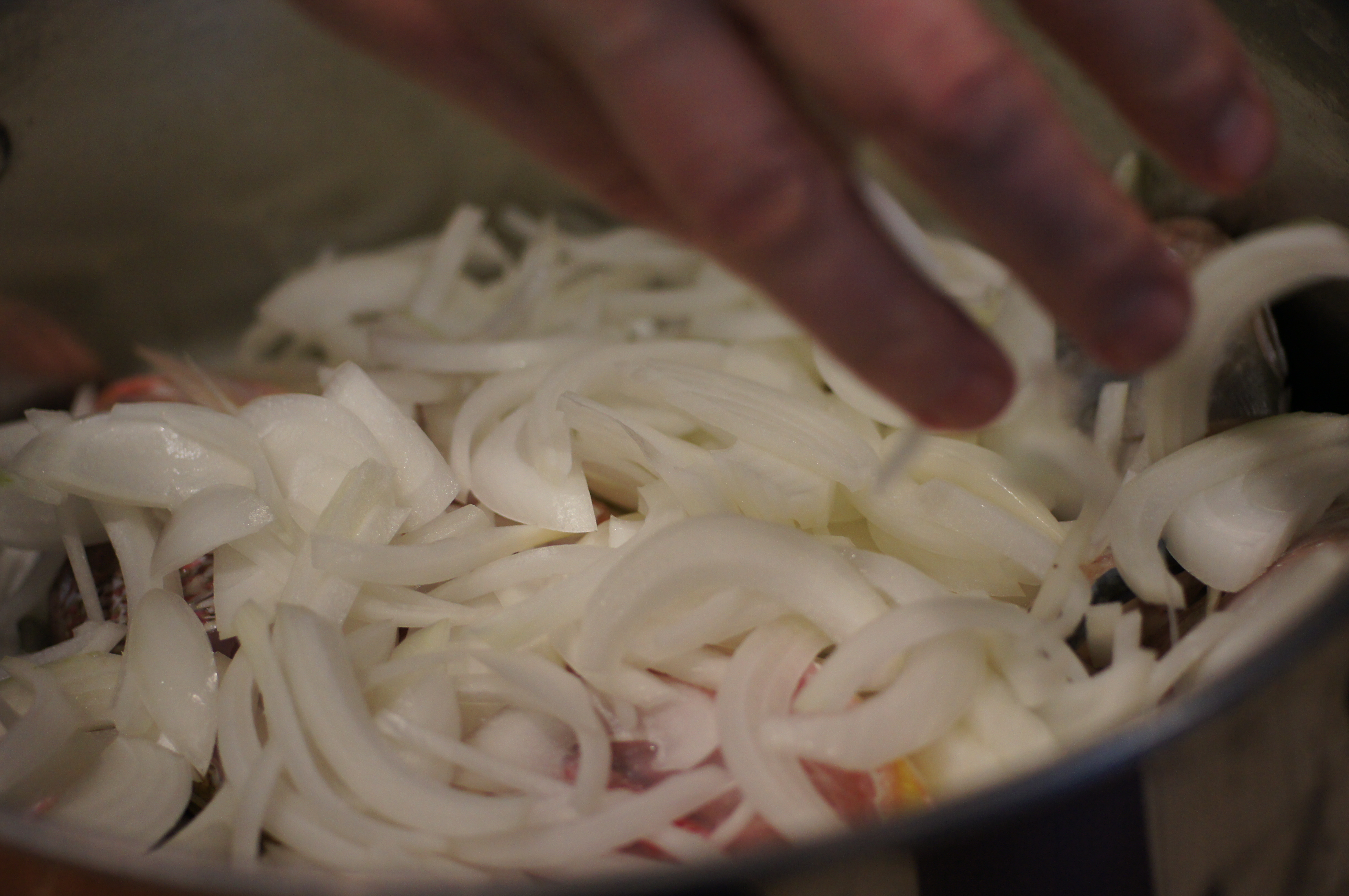 Put the rinsed fish heads and bones in a large pot and add onions.
