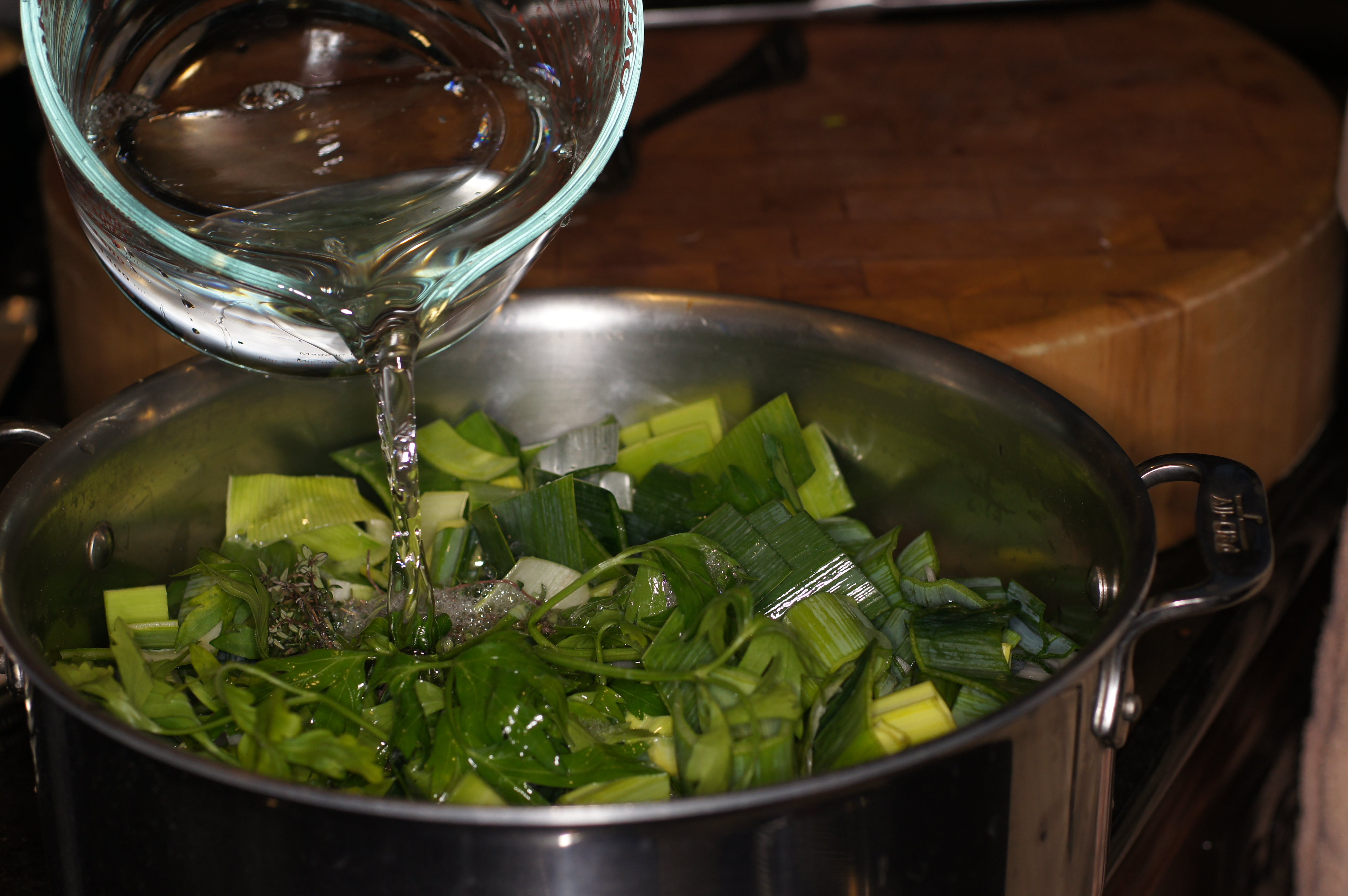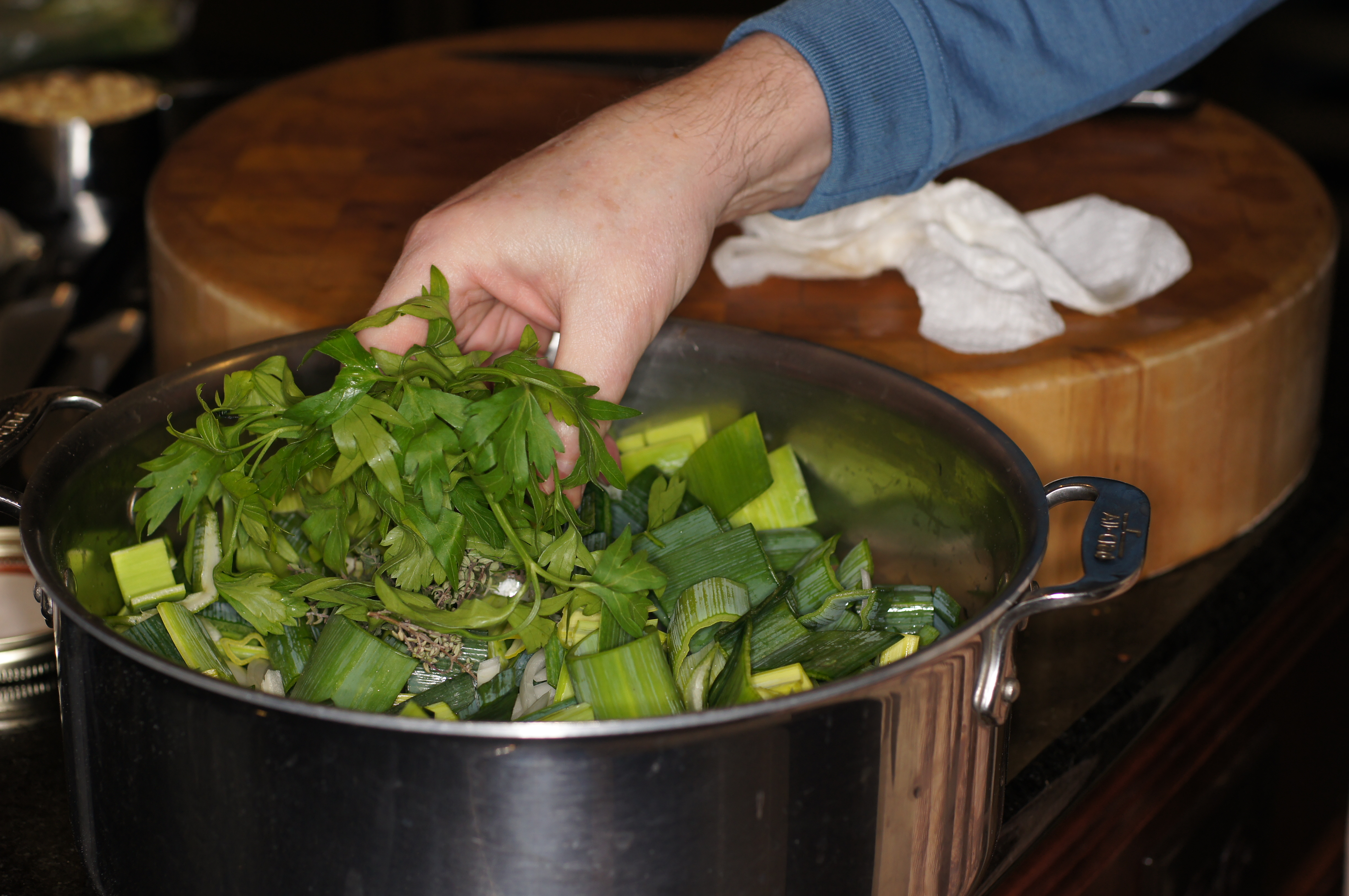 Bring the broth to a simmer and simmer for 45 minutes, or so. The eggs will cook and form a raft that traps the impurities and scum that floats to the top. When done, strain the fish stock through a fine mesh strainer lined with muslin and set aside.