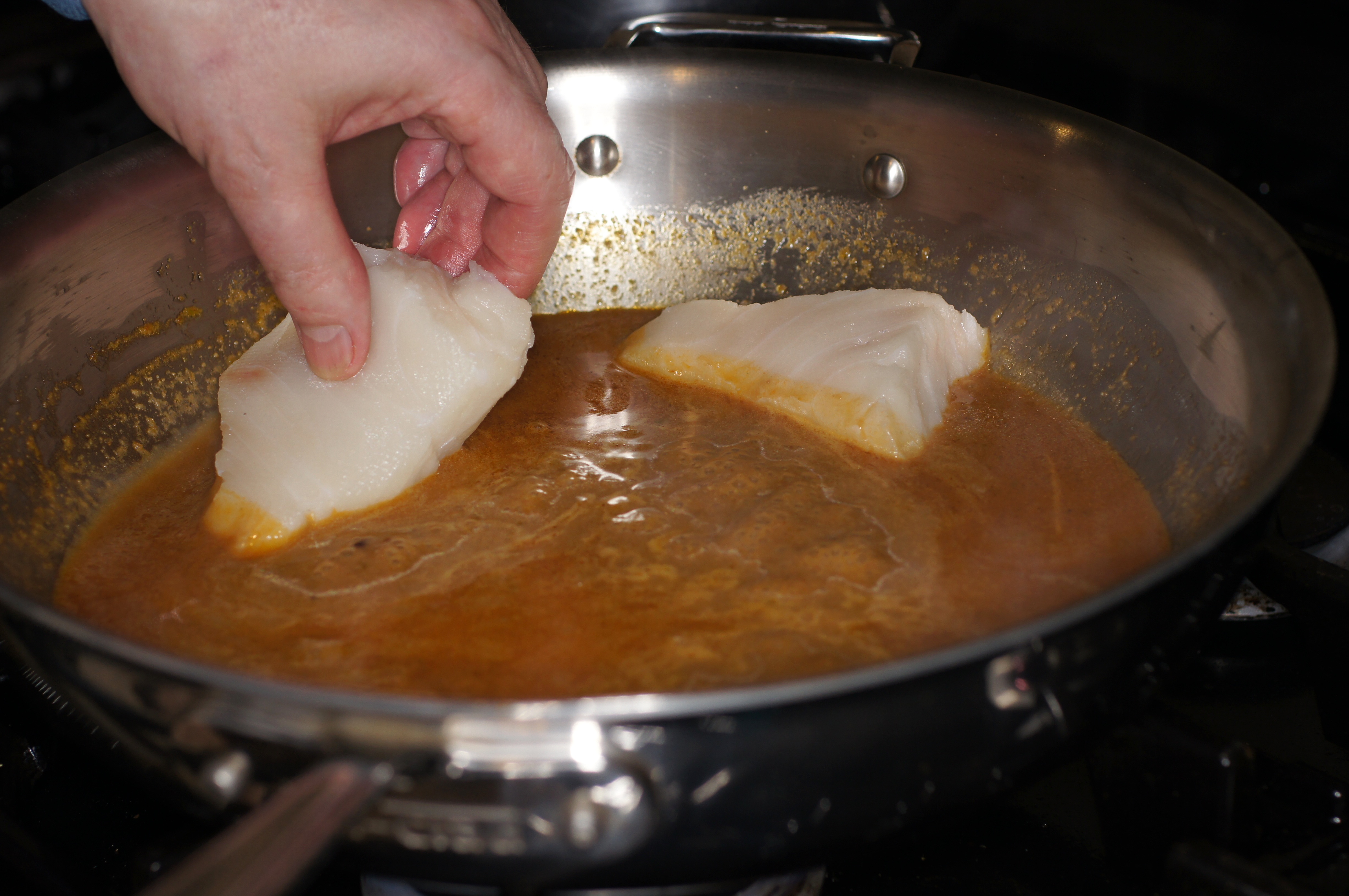 If necessary, add enough fish stock to barely cover the filets and poach until done, roughly 8 minutes per 1 inch thickness. When done, remove fish from liquid and arrange in bowls. Pour the rest of the stock into the skillet.