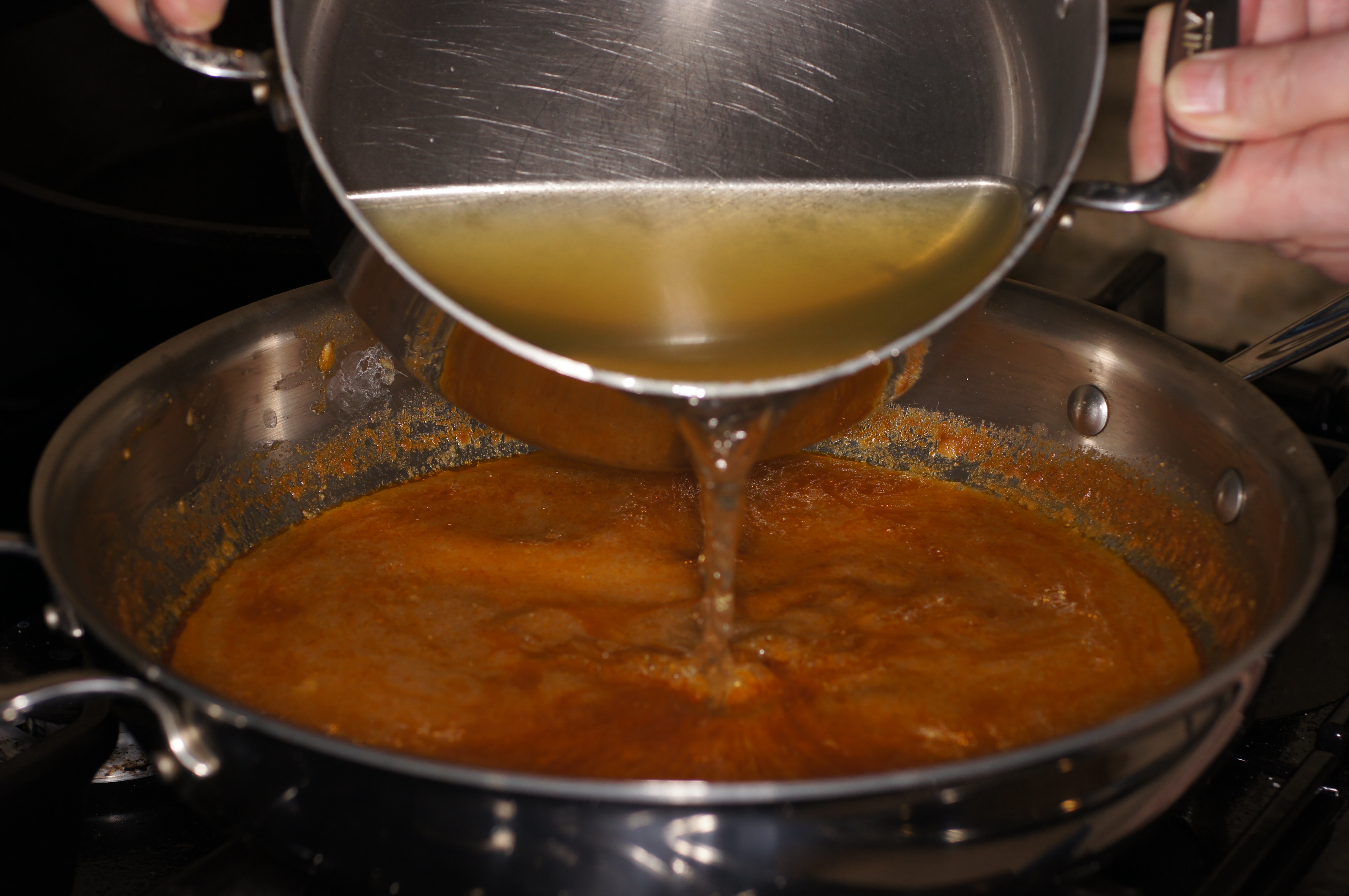 Add 2 cups of fish stock to the skillet and stir to incorporate.